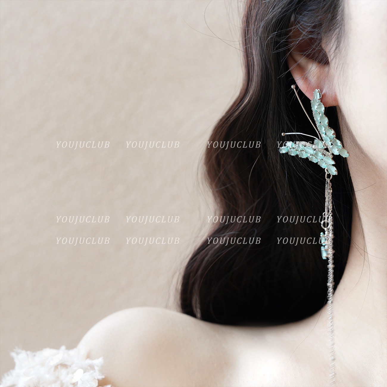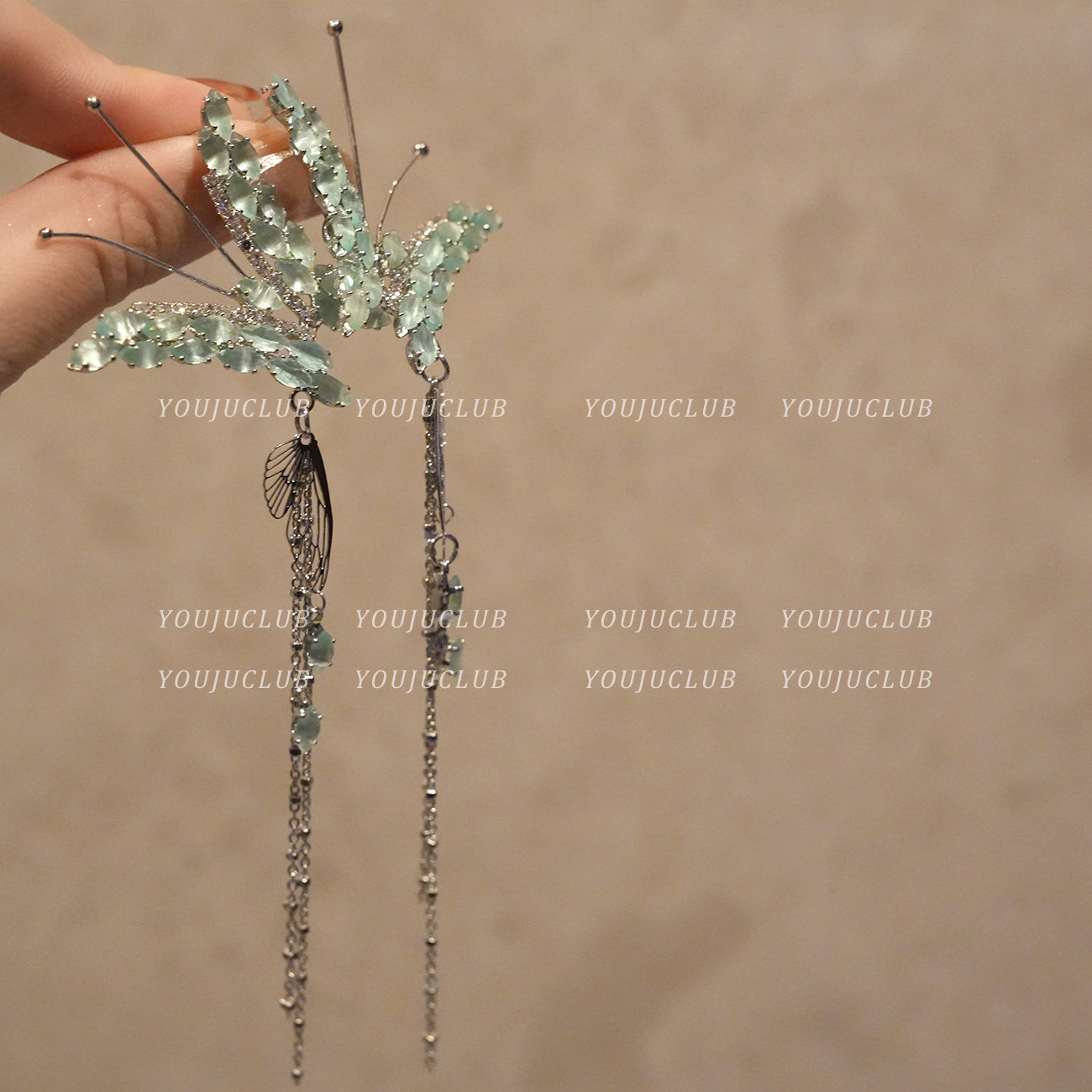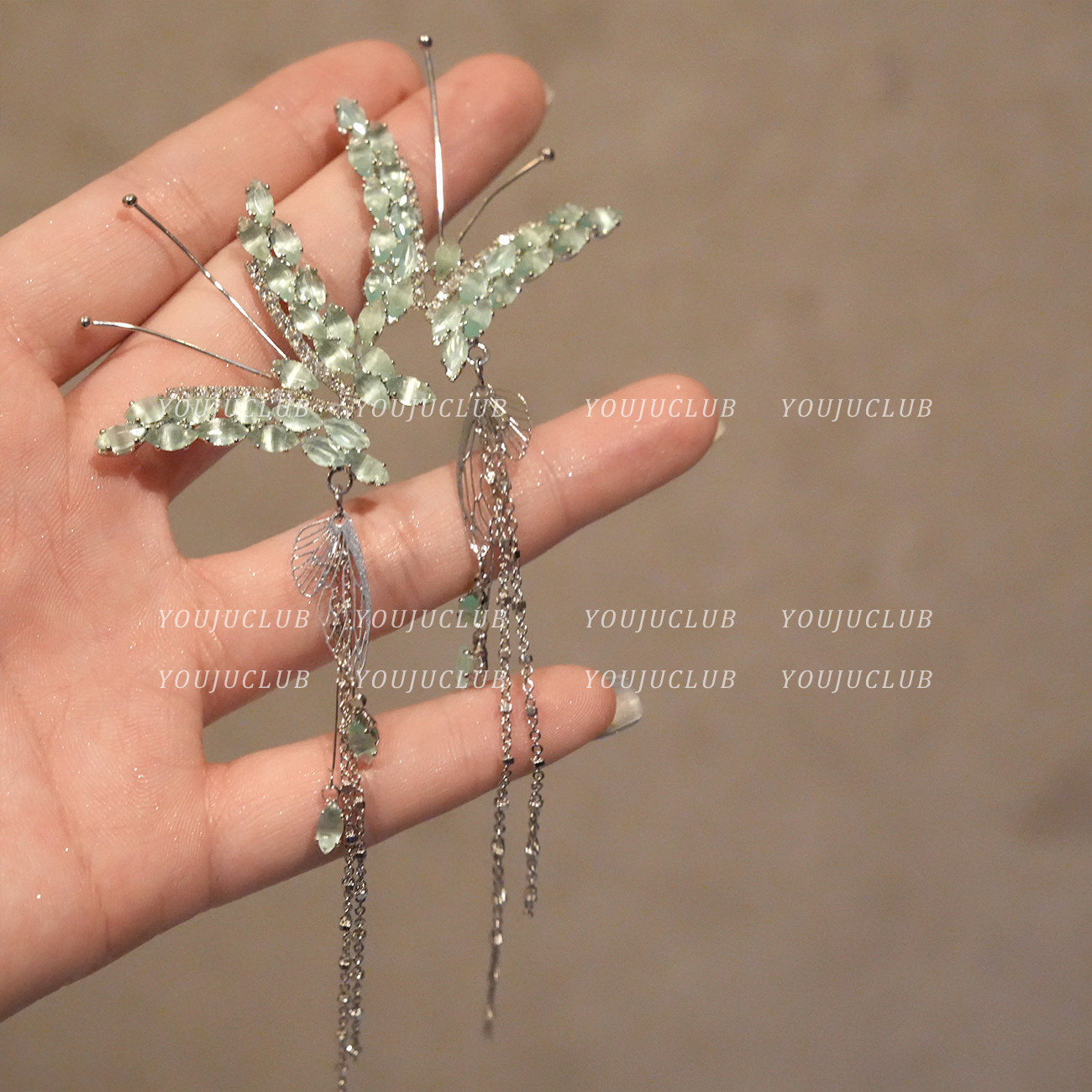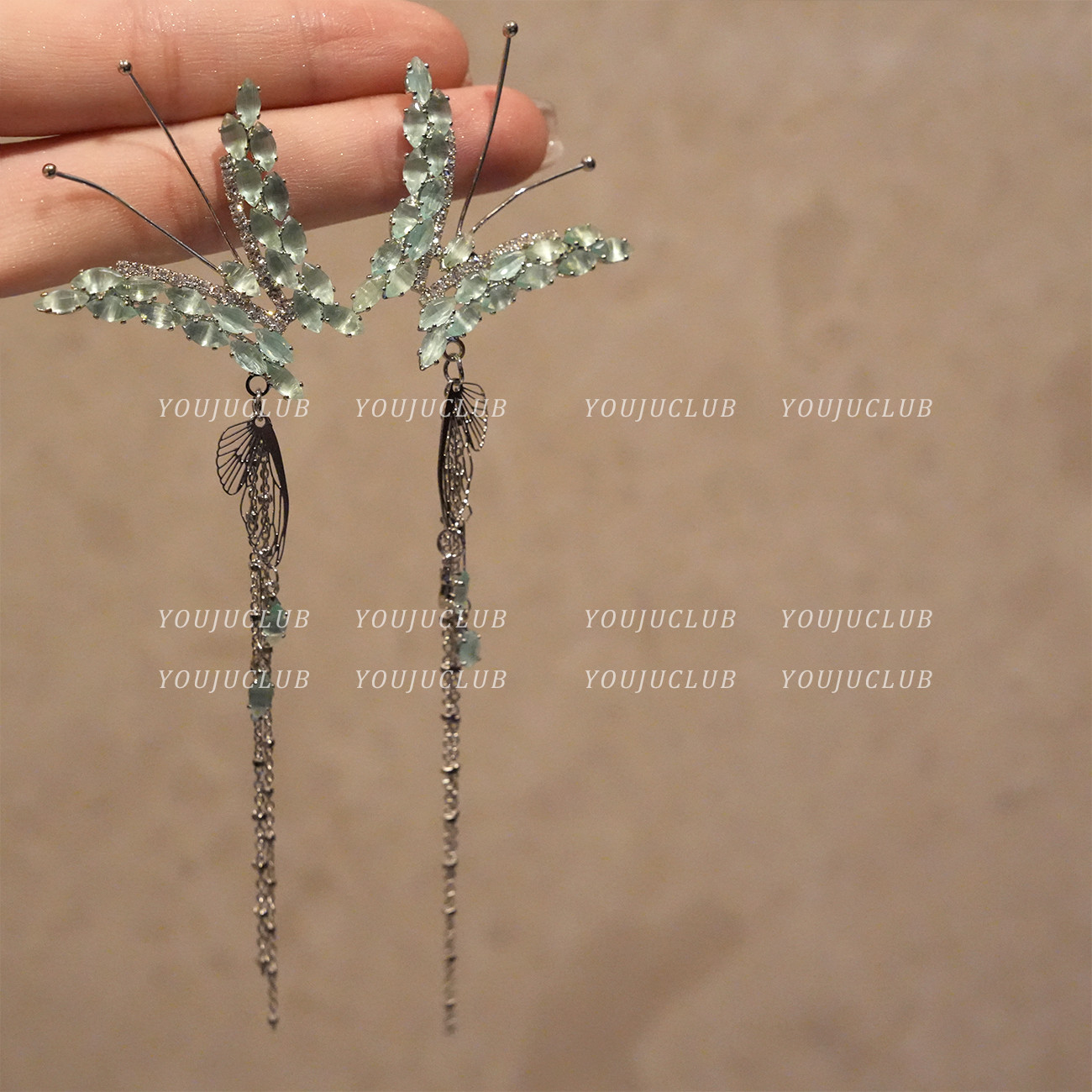 📚 YOUJUclub-仙灵蝴蝶~绿色锆石流苏耳环气质轻奢高级感长款耳夹