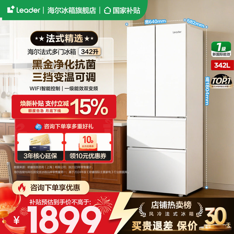📚 海尔出品统帅冰箱342升法式多开门白色一级能效无霜家用官方正品