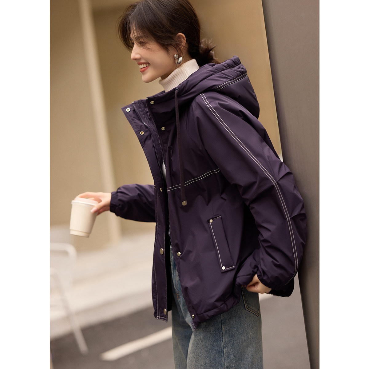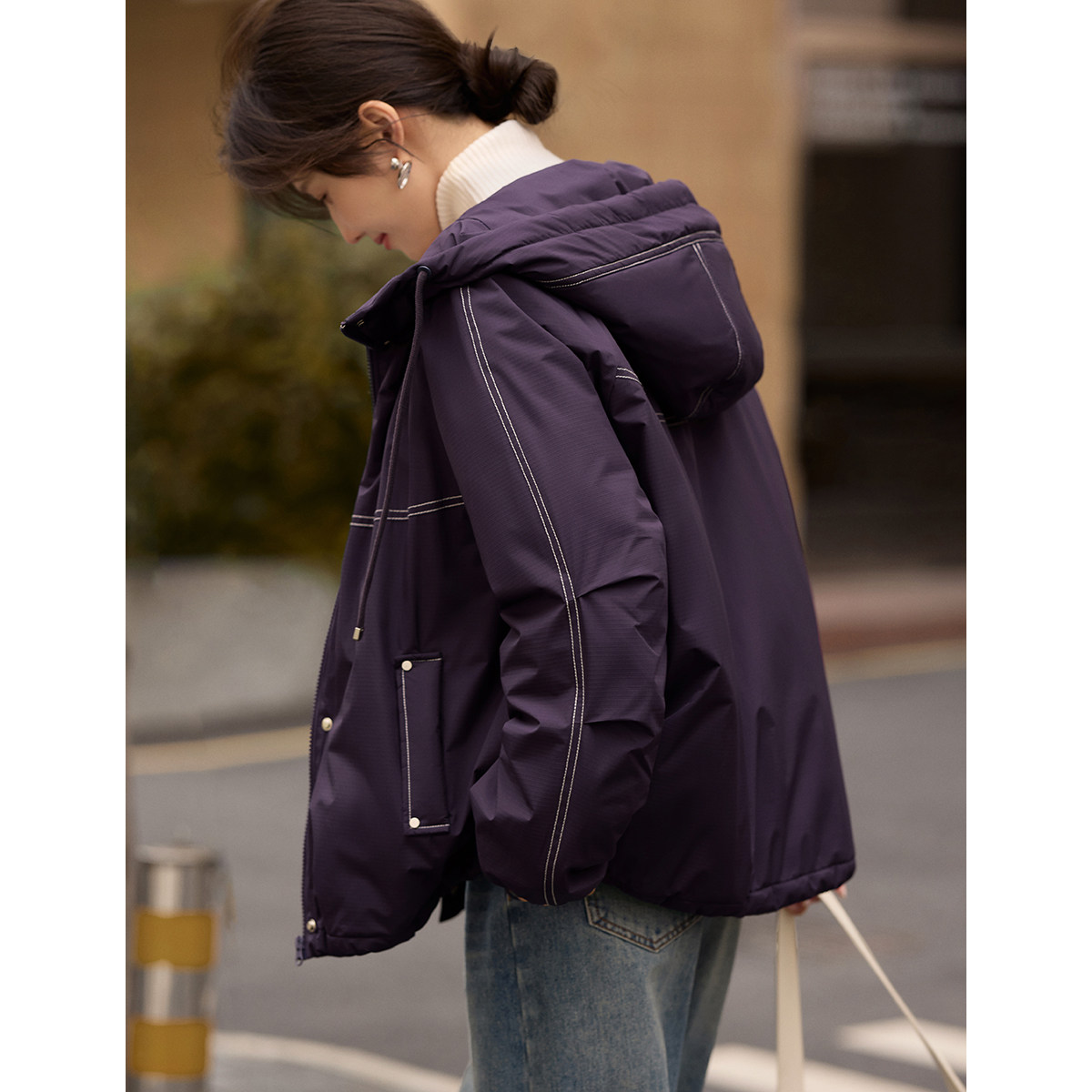 📚 XWI欣未休闲撞色夹克式棉衣棉服女2025冬季紫色抽绳连帽外套棉袄