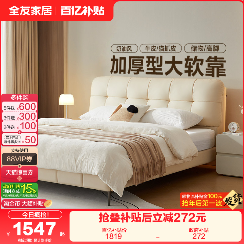 📚 全友家居奶油风单人储物床1米5新款主卧室高脚真皮床1米8双人床