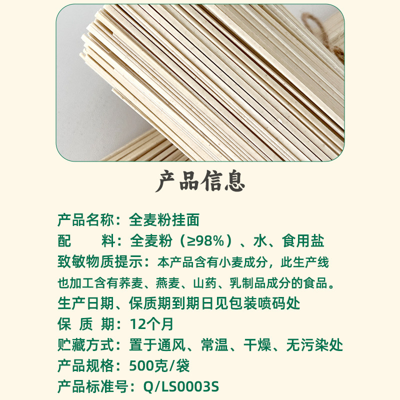 📚 利生全麦粉挂面500g/袋 无添加全麦面粉挂面早餐速食健康低脂挂面