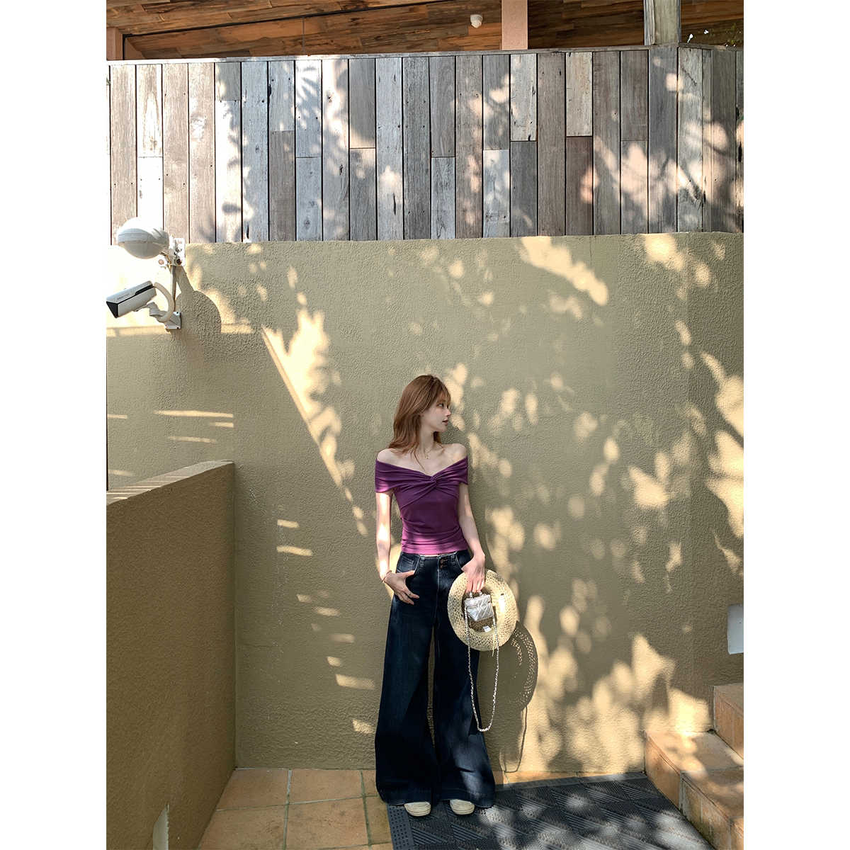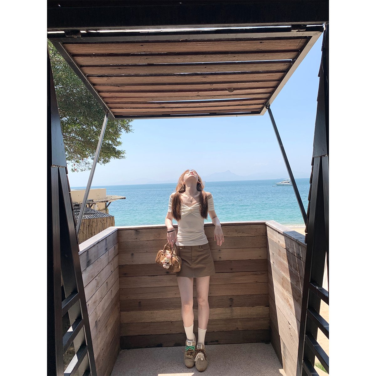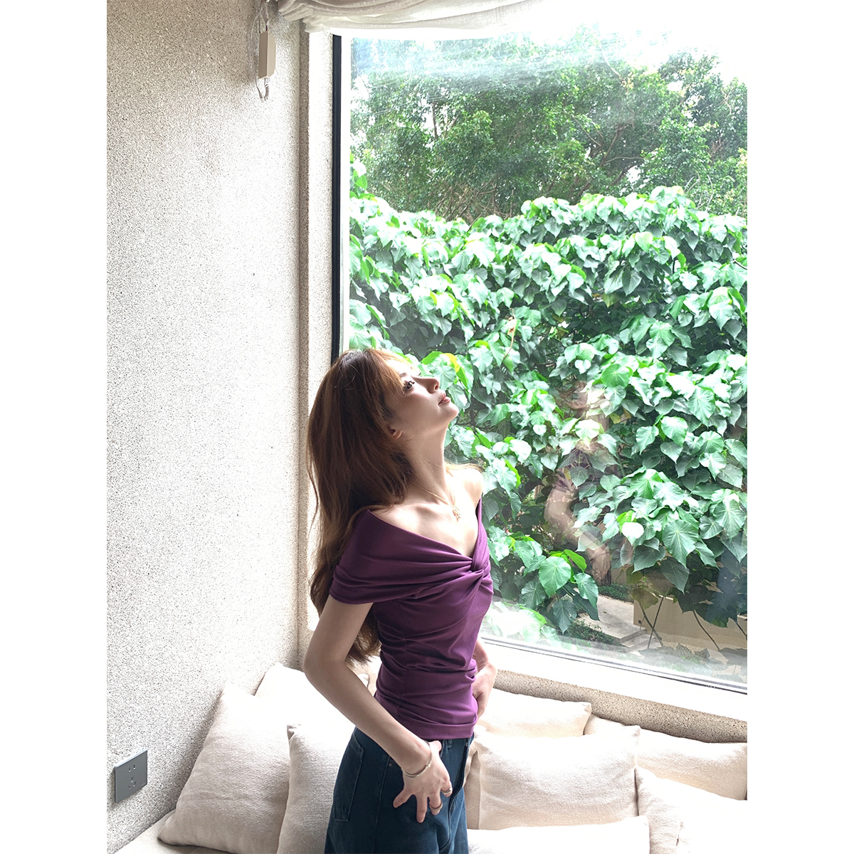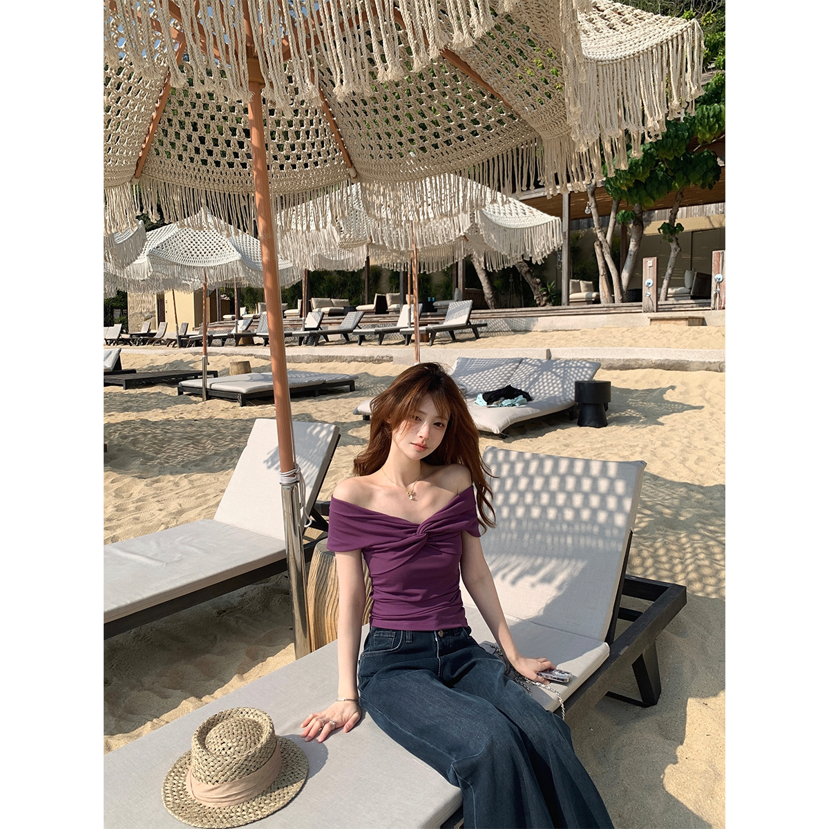 📚 Zzhen珍珍 高阶温柔扭结褶皱蝴蝶结短袖上衣显瘦一字肩纯欲V领T恤