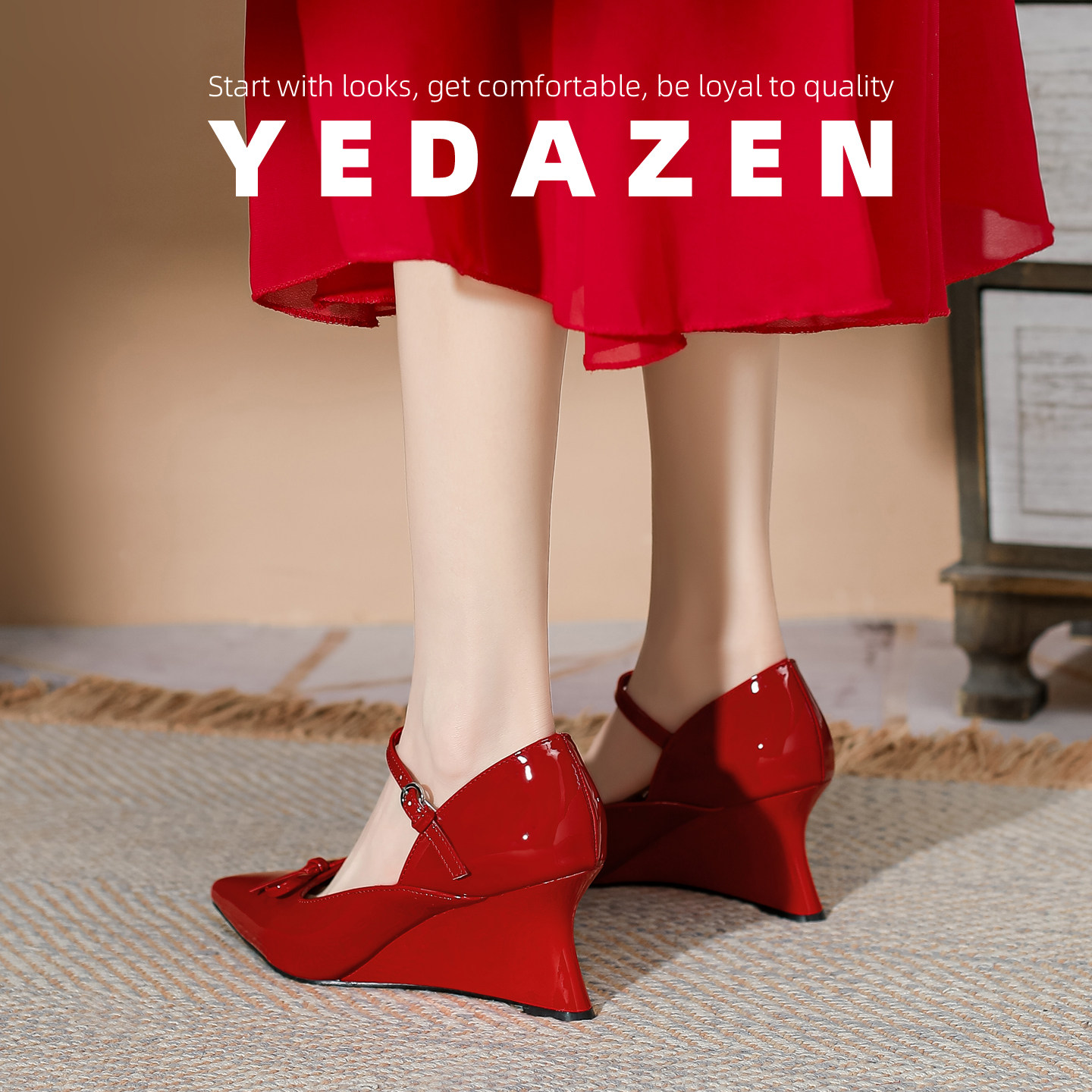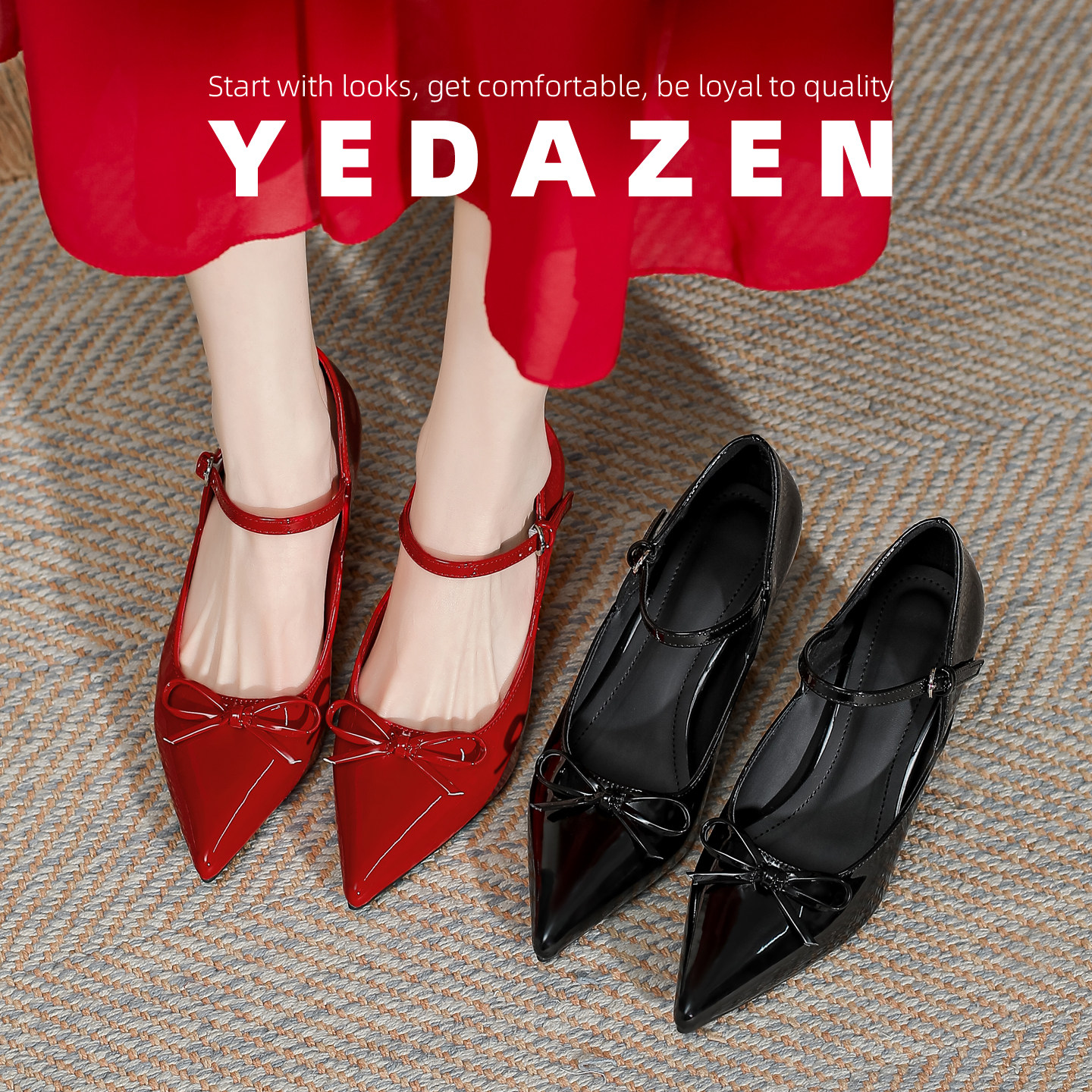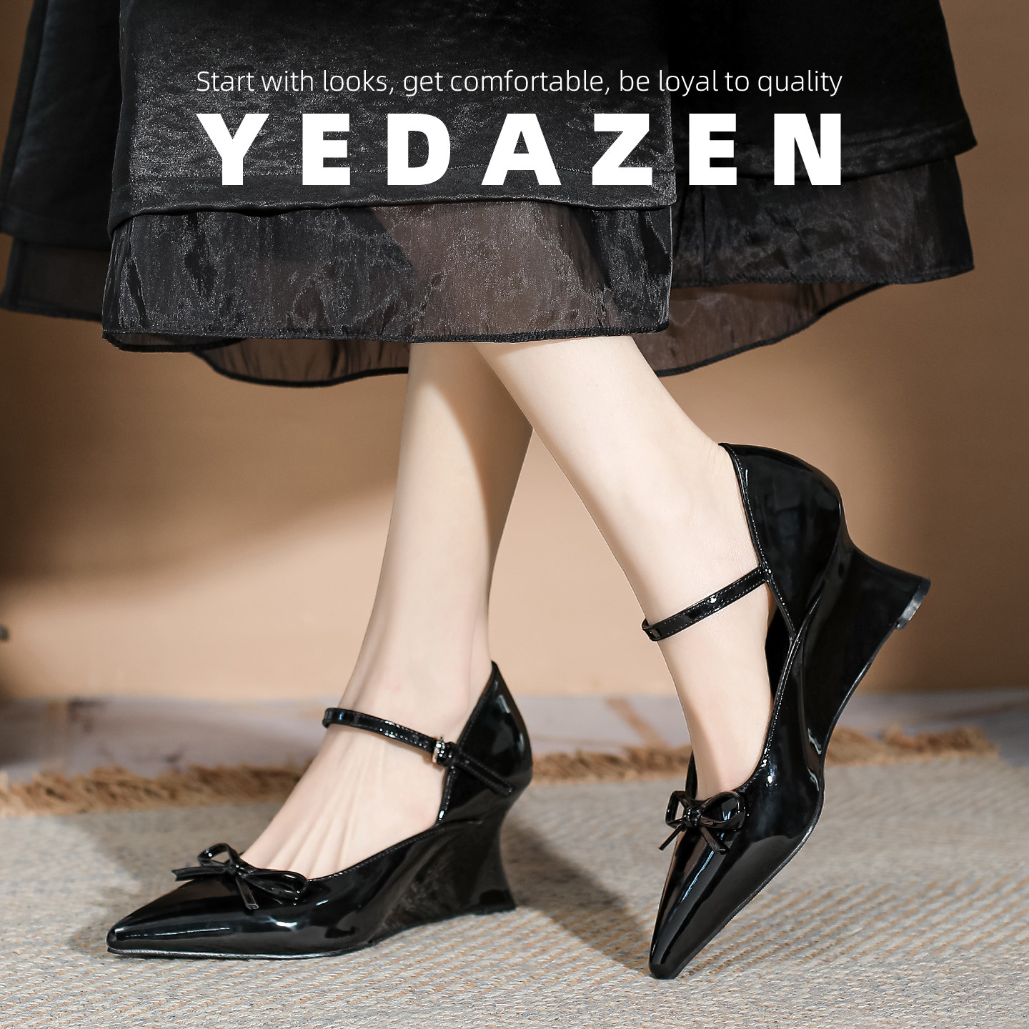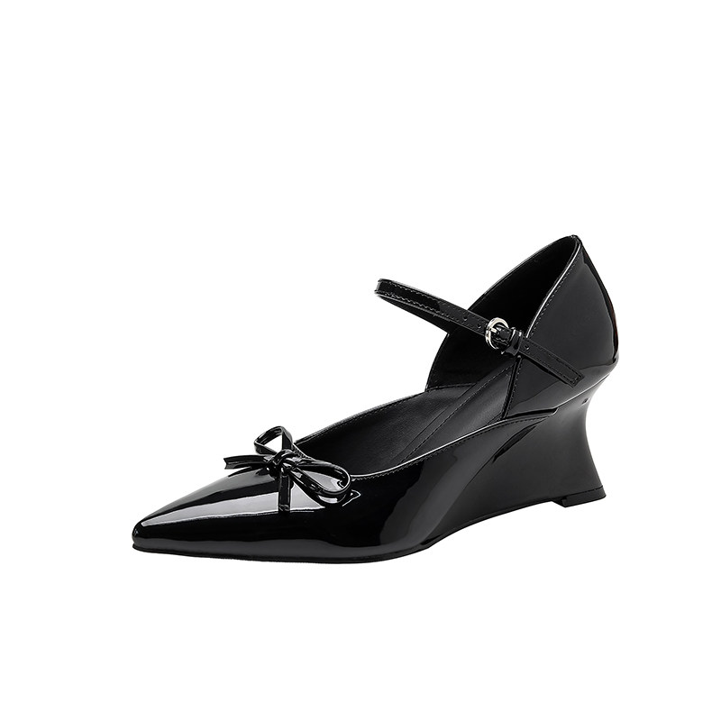 📚 法式黑色玛丽珍鞋女春季坡跟尖头蝴蝶结高跟鞋一字带复古漆皮单鞋