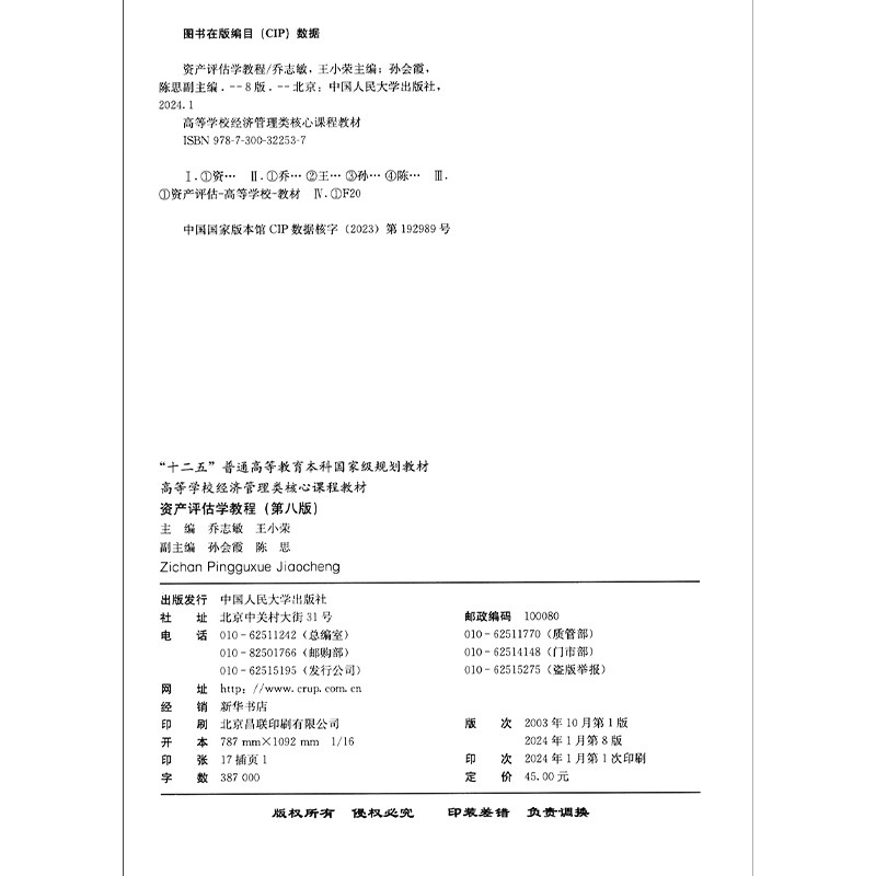 📚 正版2024新书 资产评估学教程 第八版 乔志敏 王小荣 高等学校经济管理类核心课程教材 中国人民大学出版社9787300322537