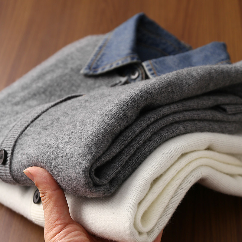 📚 淘么淘 时髦不费力 假两件牛仔拼接翻领羊毛针织开衫上衣毛衣春款