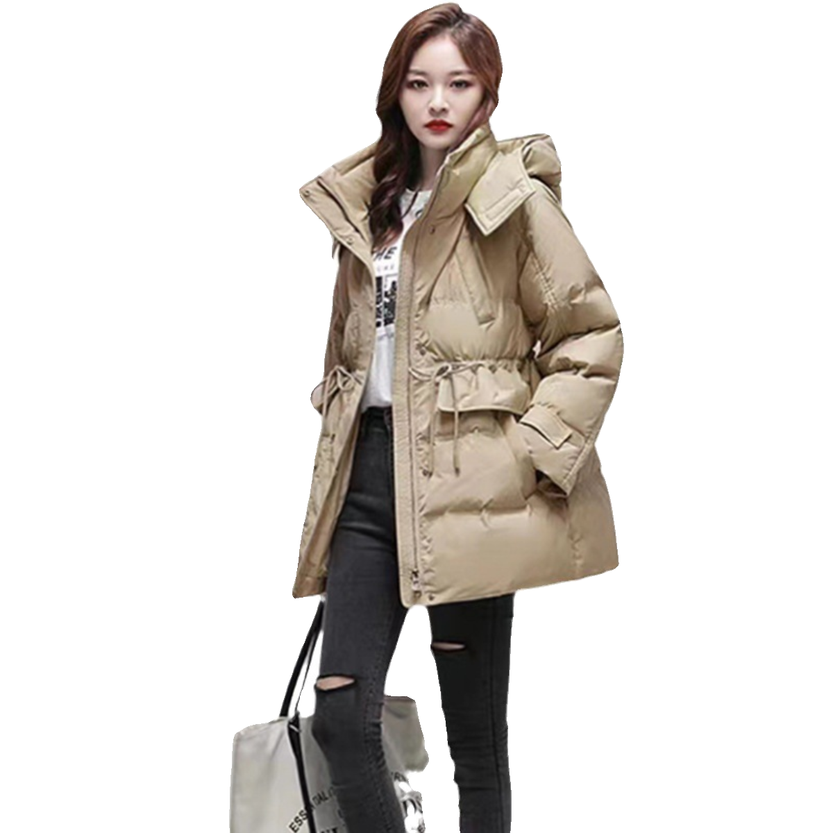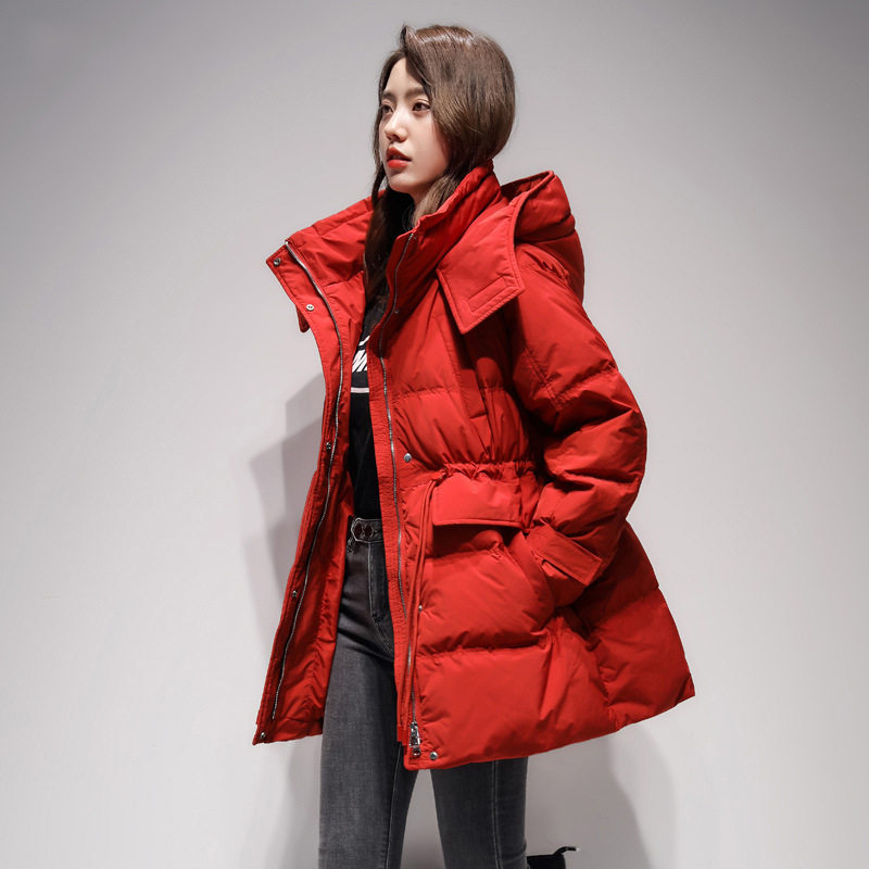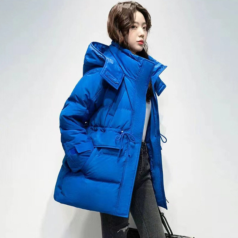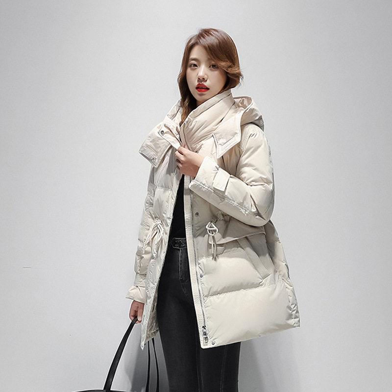 📚 2025秋冬新款白鸭鸭绒立领连帽抽绳收腰羽绒服女中长款外套小个子