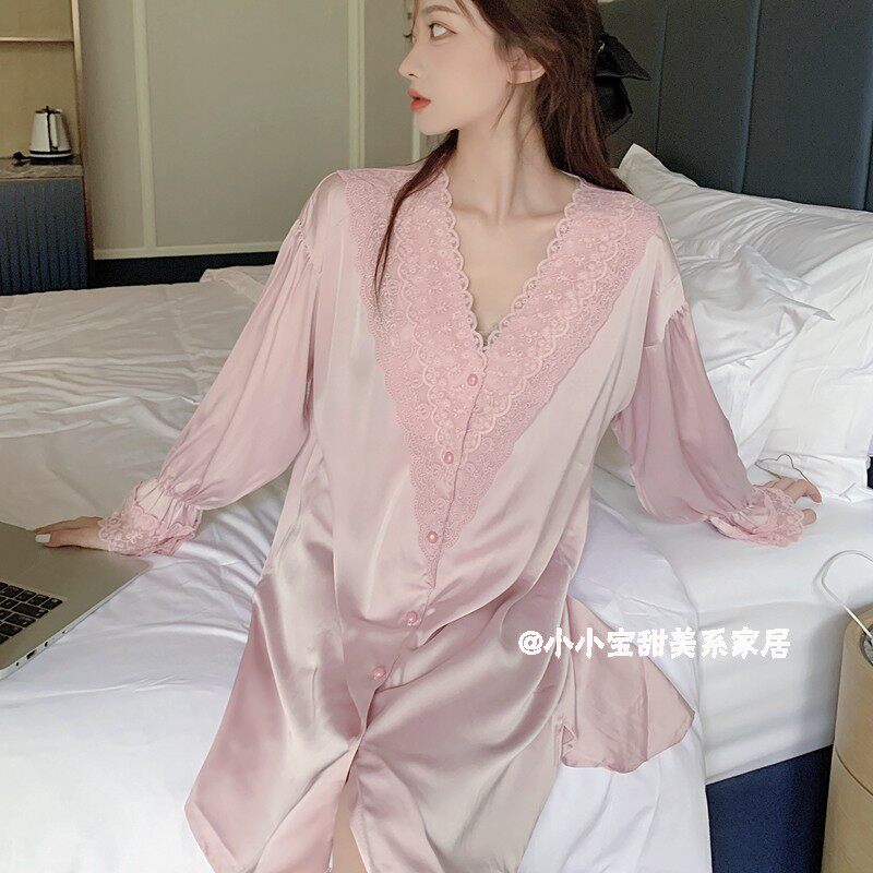 📚 中长款睡裙女春秋冰丝长袖性感蕾丝甜美薄款绸缎白衬衫睡衣纯欲风