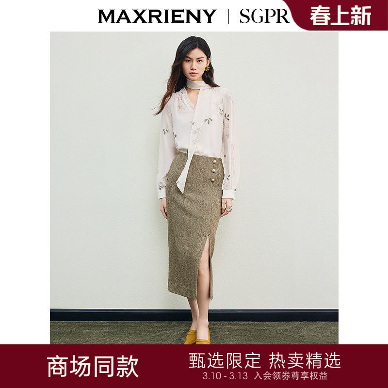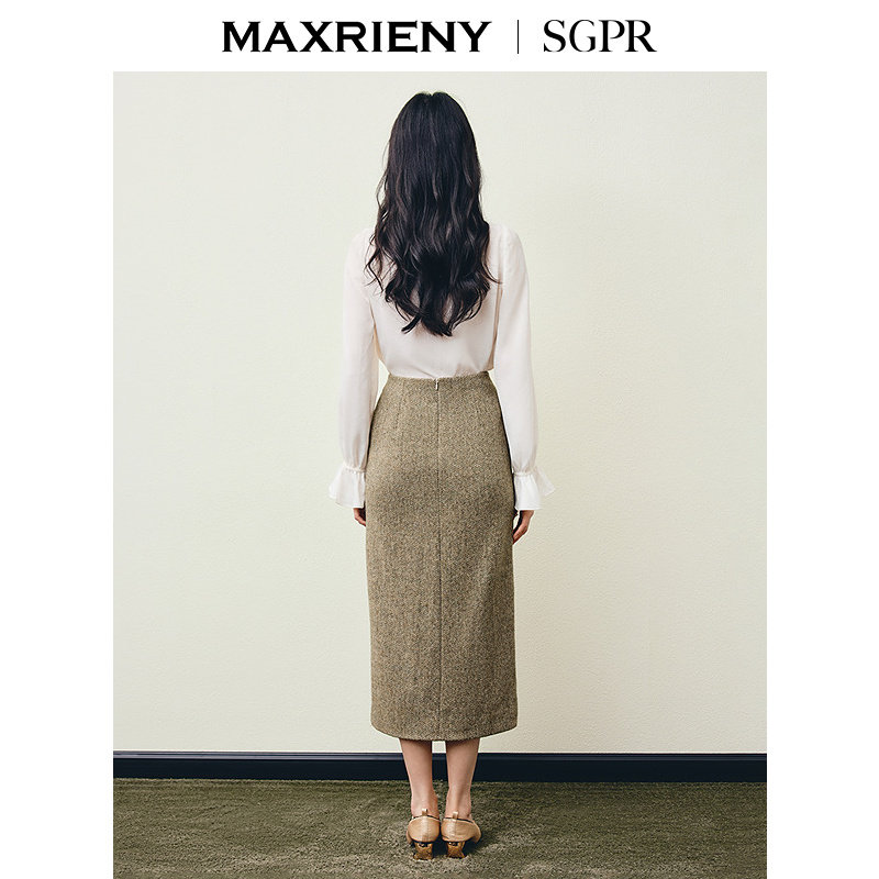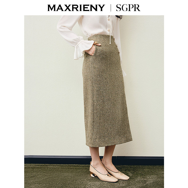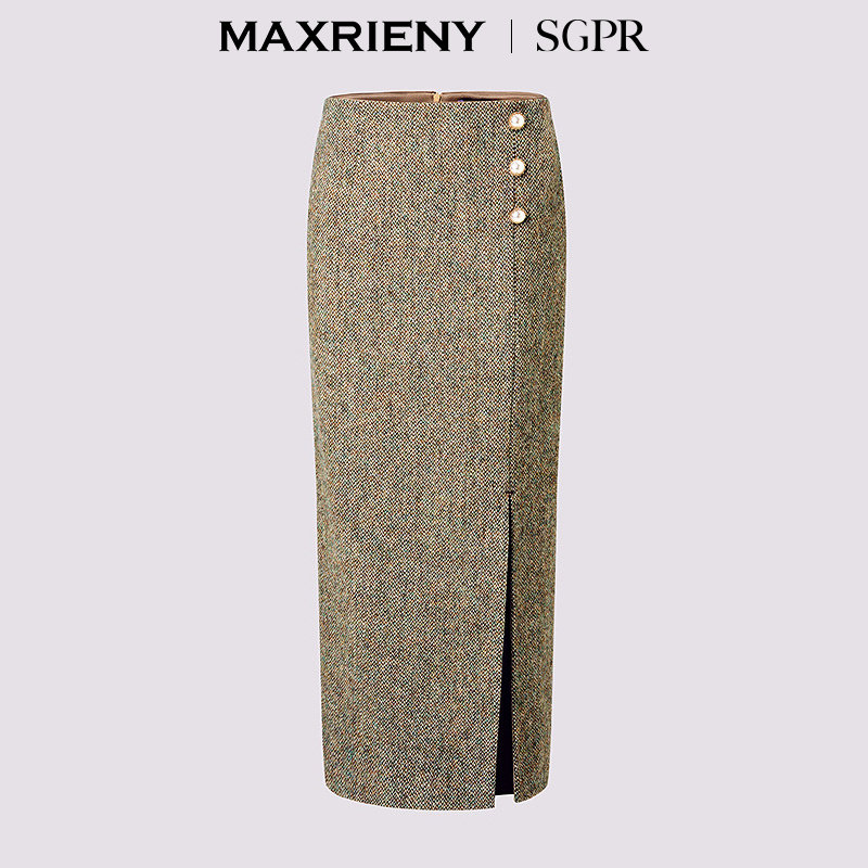 📚 【SGPR】水绿色开衩半身裙2026年春季新款钉珠纯羊毛通勤H型半裙