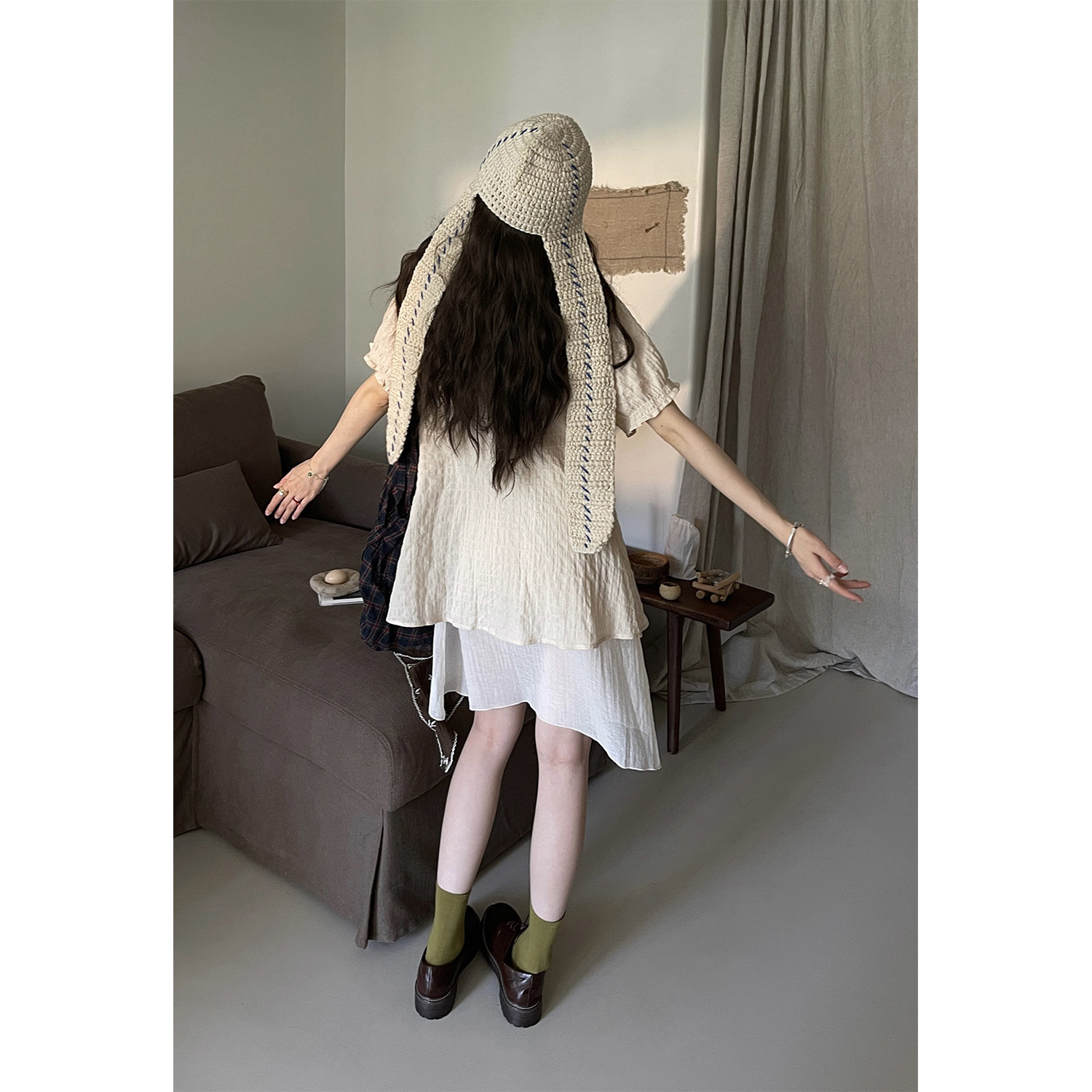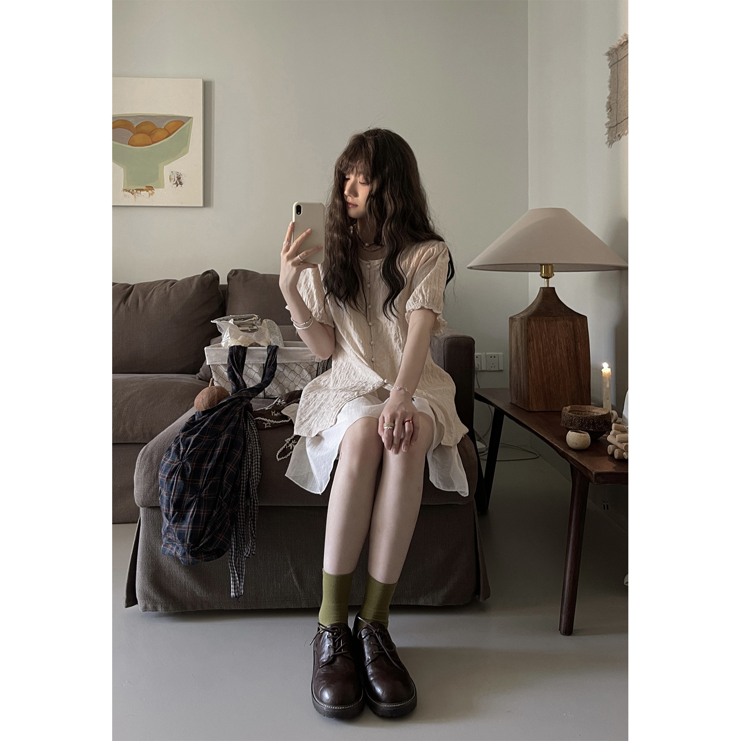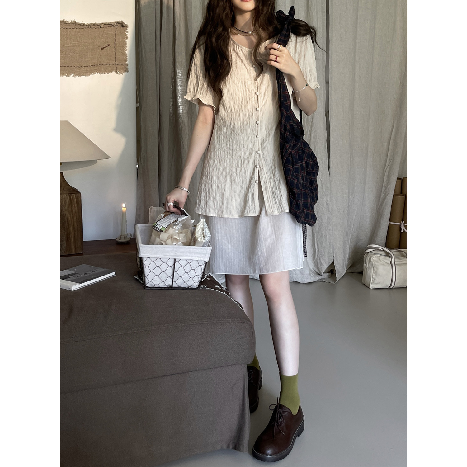 📚 JMWOMEN森林之域 米黄色复古棉质短袖衬衫女夏薄款宽松中长款上衣