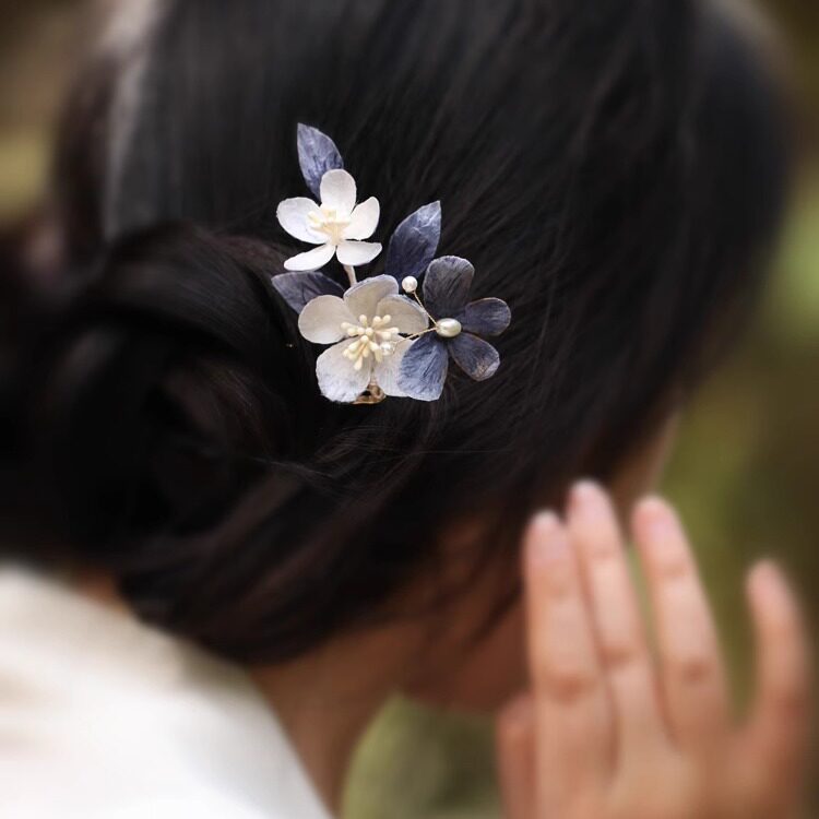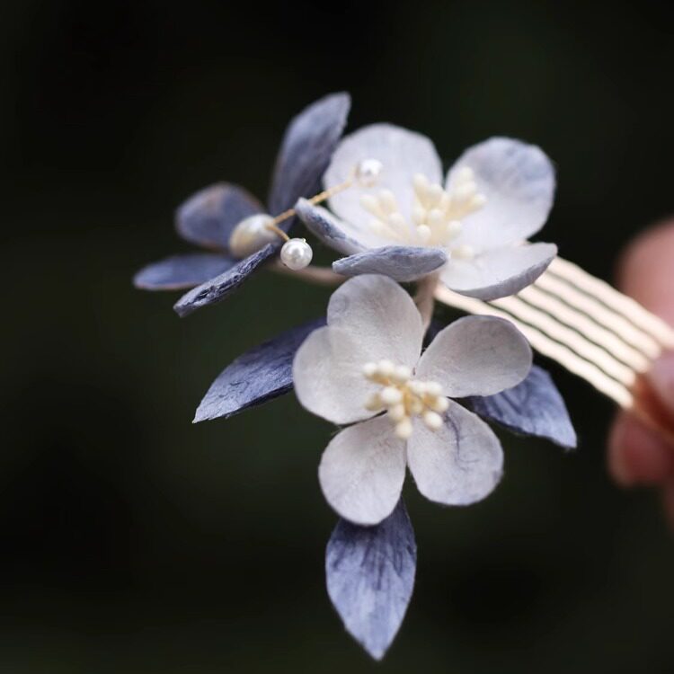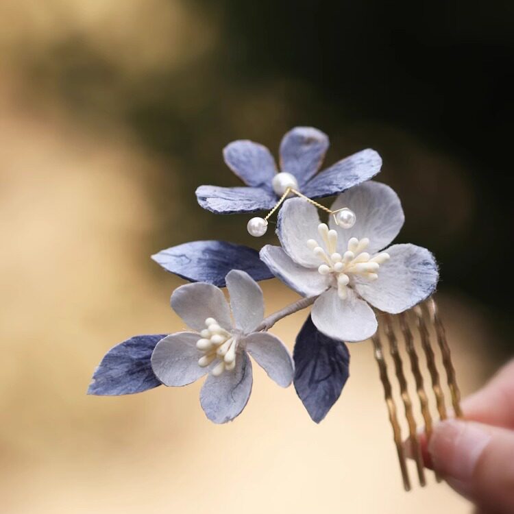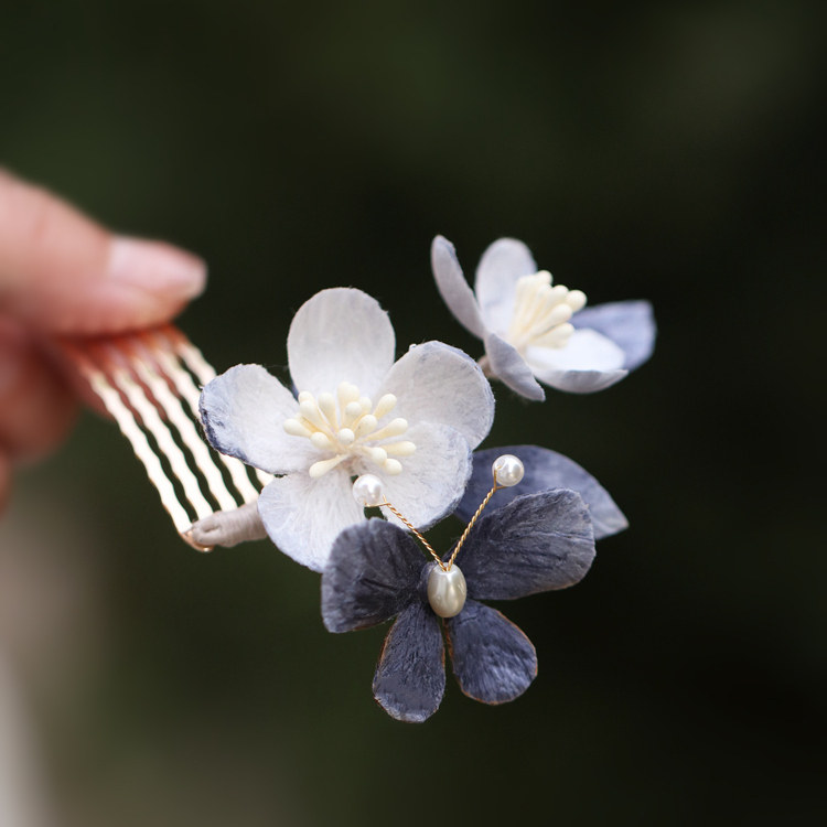 📚 成品手工绒花发梳蓝色头饰插梳古风旗袍汉服发饰新中式日常发簪