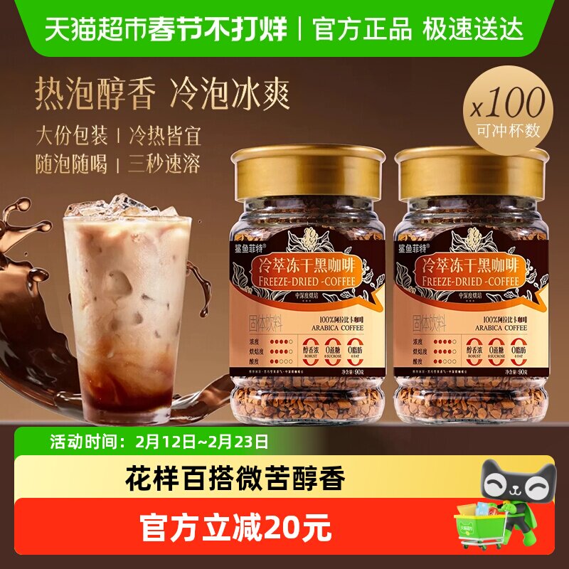 📚 鲨鱼菲特黑咖啡冻干冷萃速溶粉美式无糖拿铁云南小粒咖啡2罐