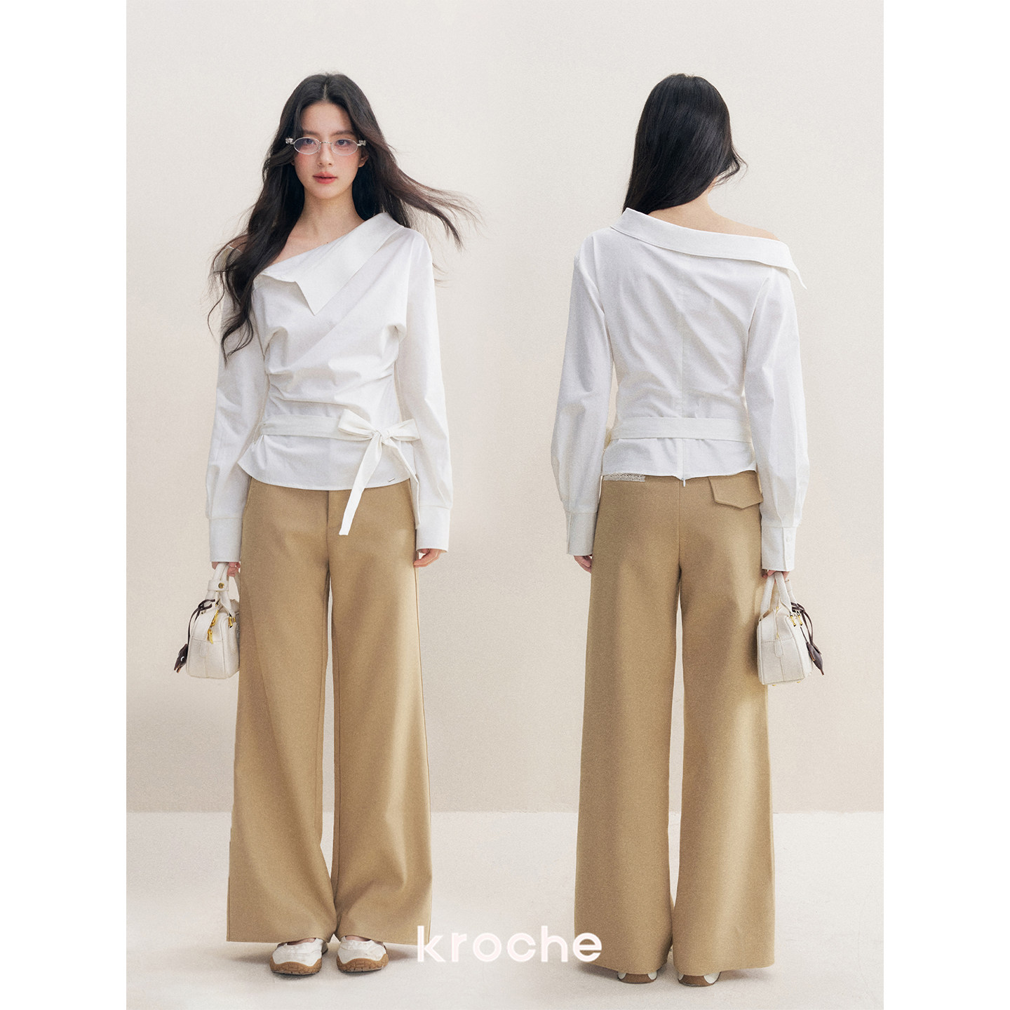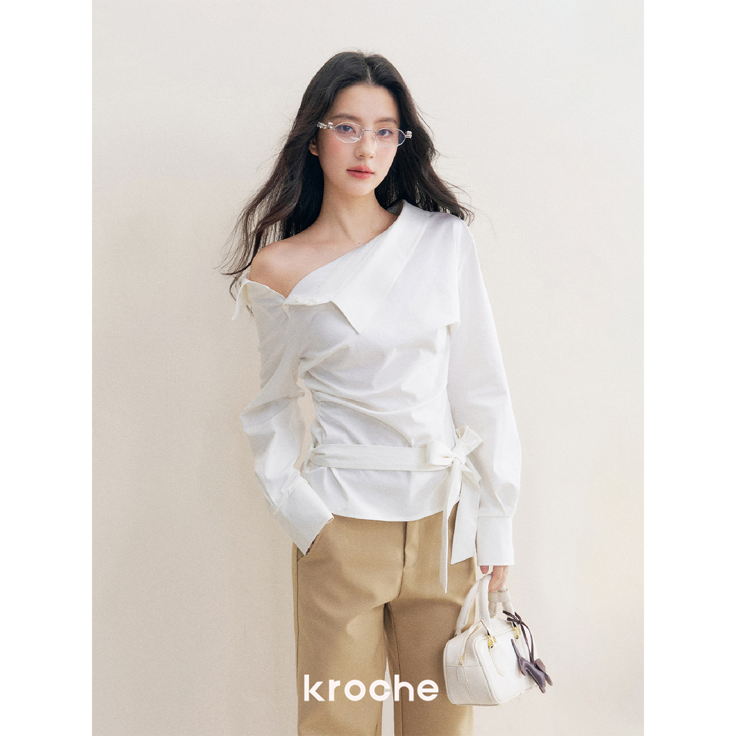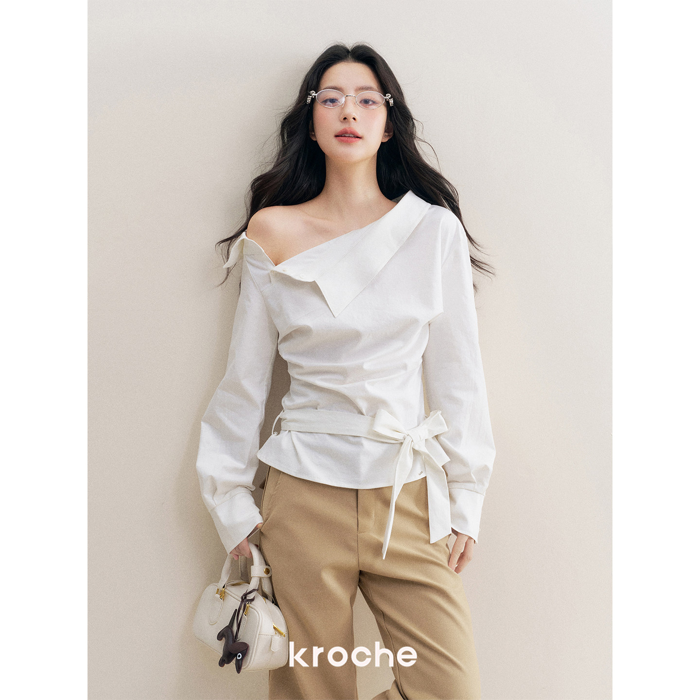 📚 Kroche Geek chic 舒适棉感不规则抽褶系带修身斜肩长袖衬衫