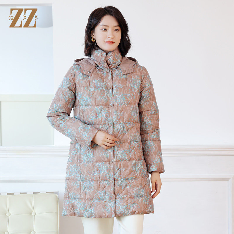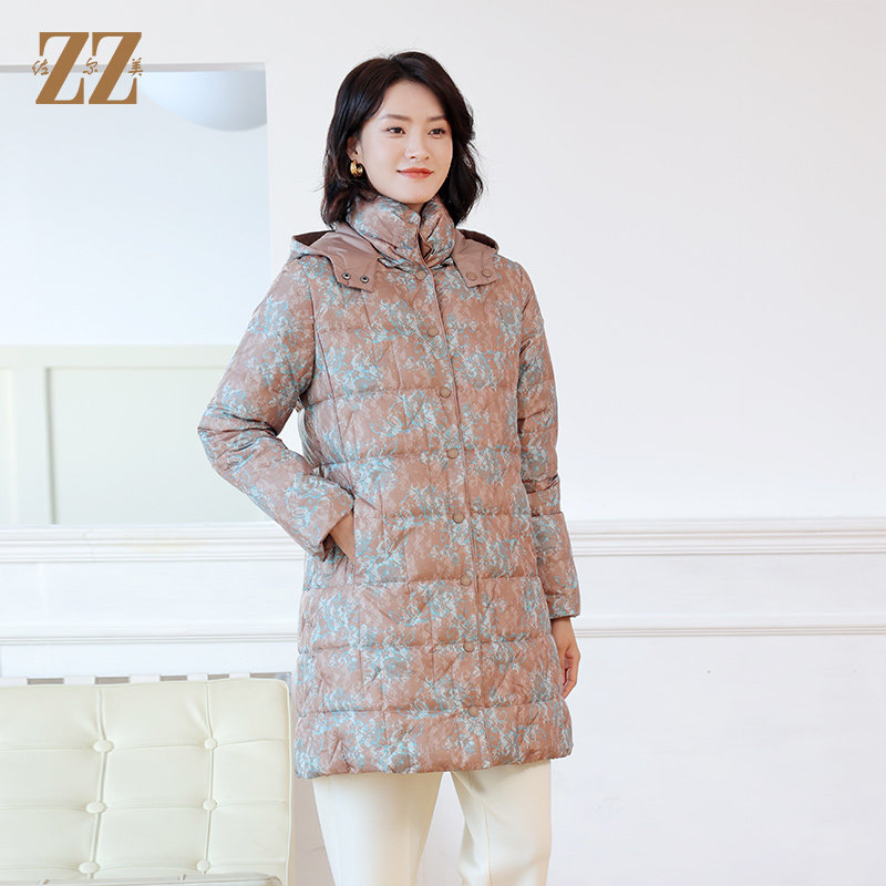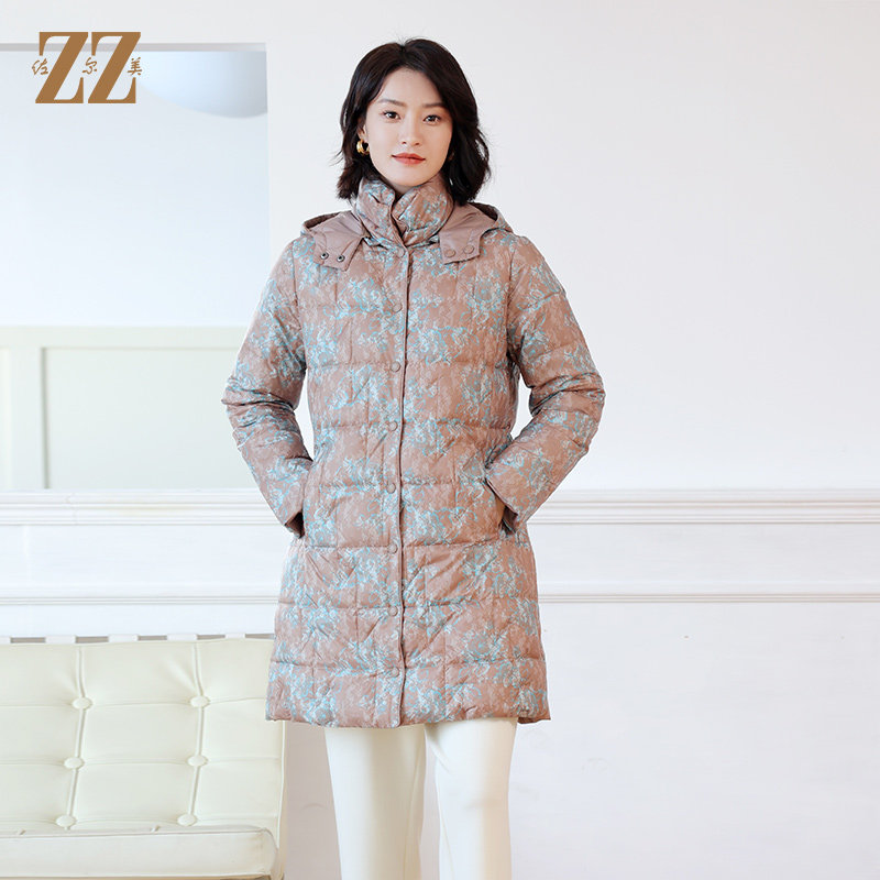 📚 佐尔美冬季新款 时尚双面穿花色中长款可拆帽领羽绒服女E24YY03