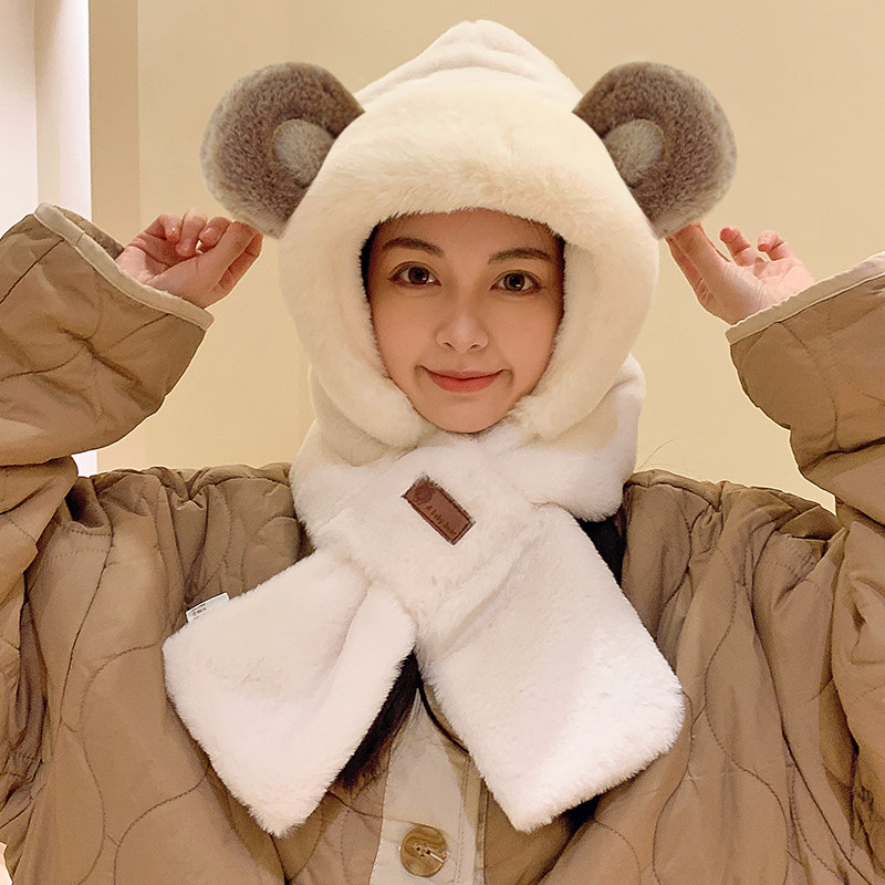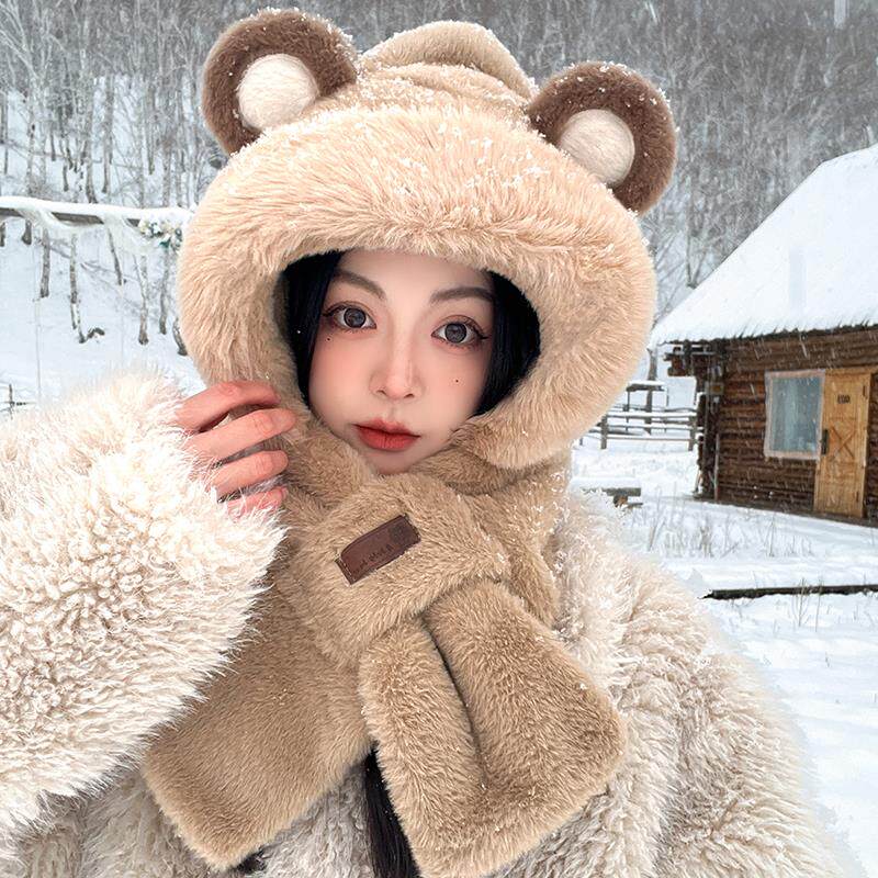 📚 毛绒小熊帽子围巾一体女款2025新款秋冬季手套连帽围脖骑行三件套