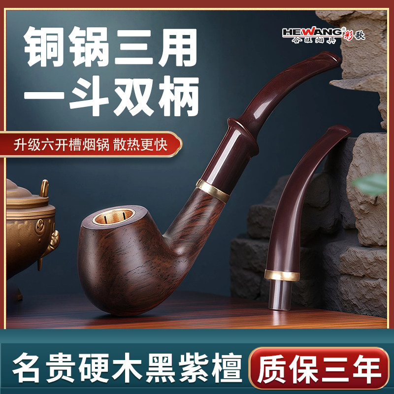📚 合旺实木三用烟斗手工弯式过滤石楠木男士老式传统中式旱烟袋铜锅