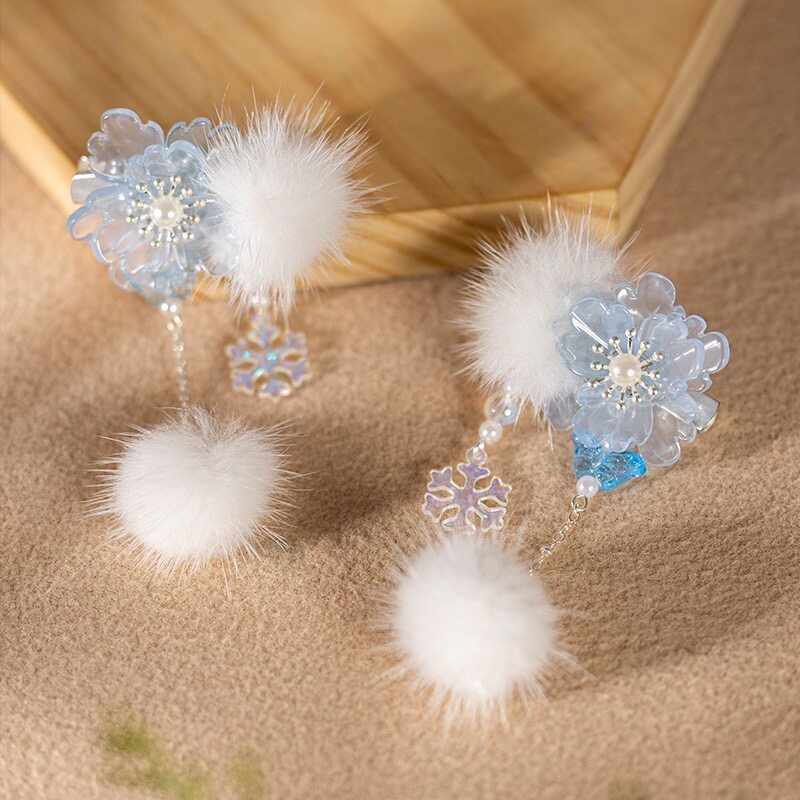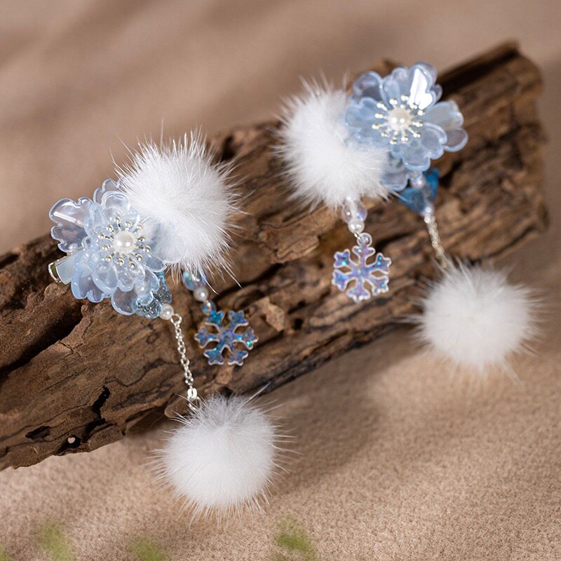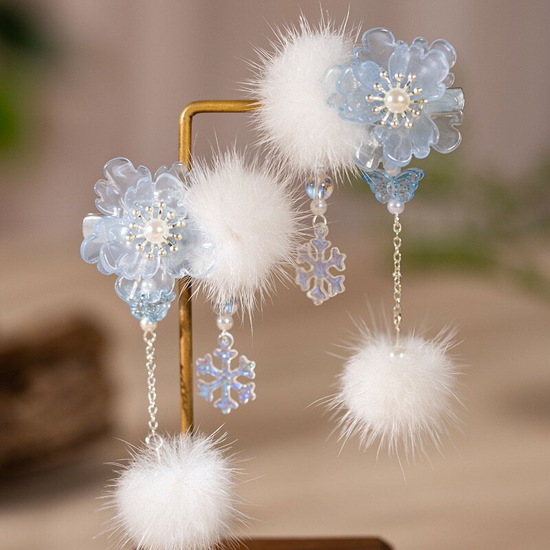 📚 明制汉服头饰儿童古风雪花毛球流苏发夹套装女童发饰中国风配饰