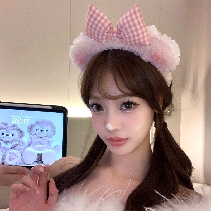 📚 可爱粉色蝴蝶结毛绒发箍女小熊蕾丝边洗脸头箍高颅顶发卡头饰发饰