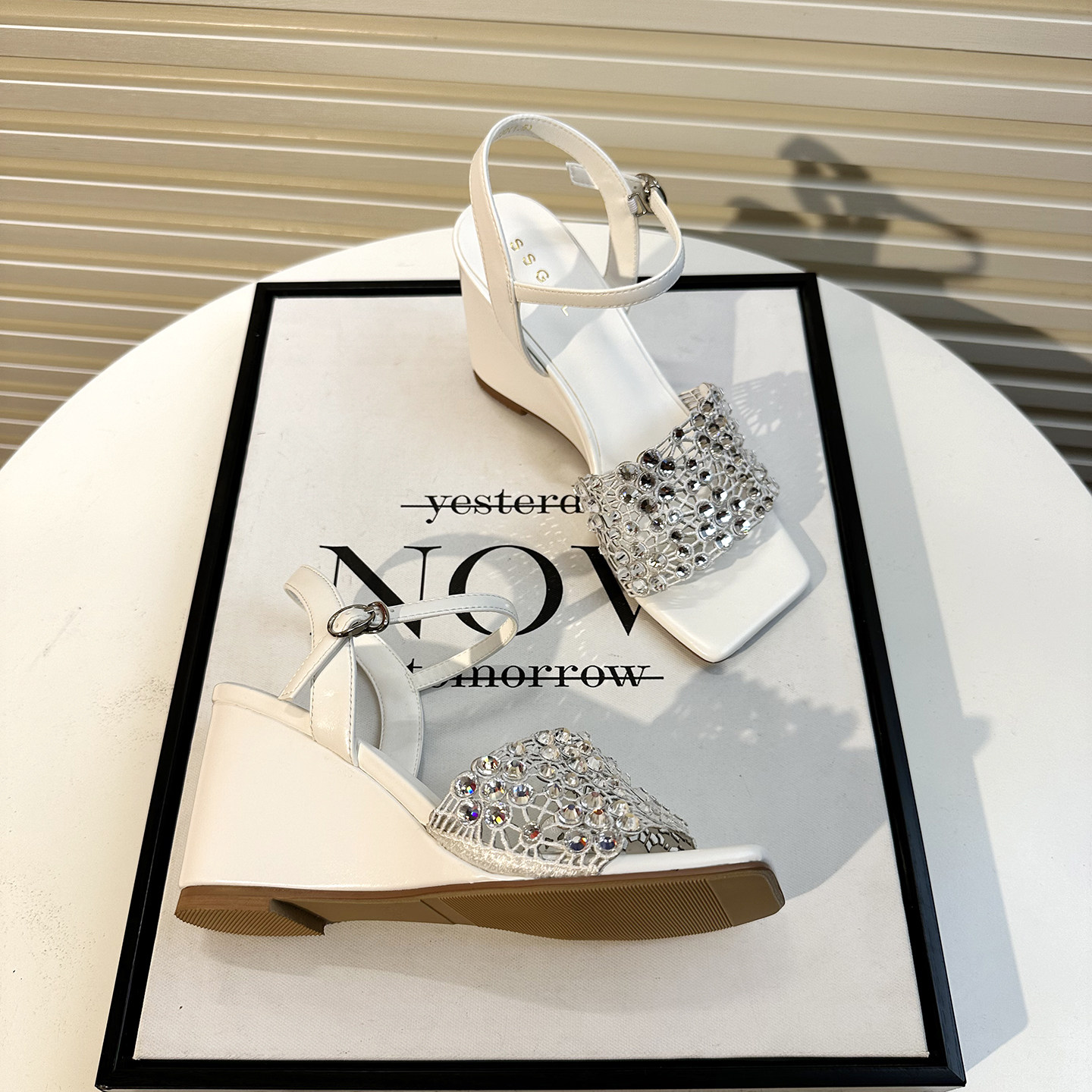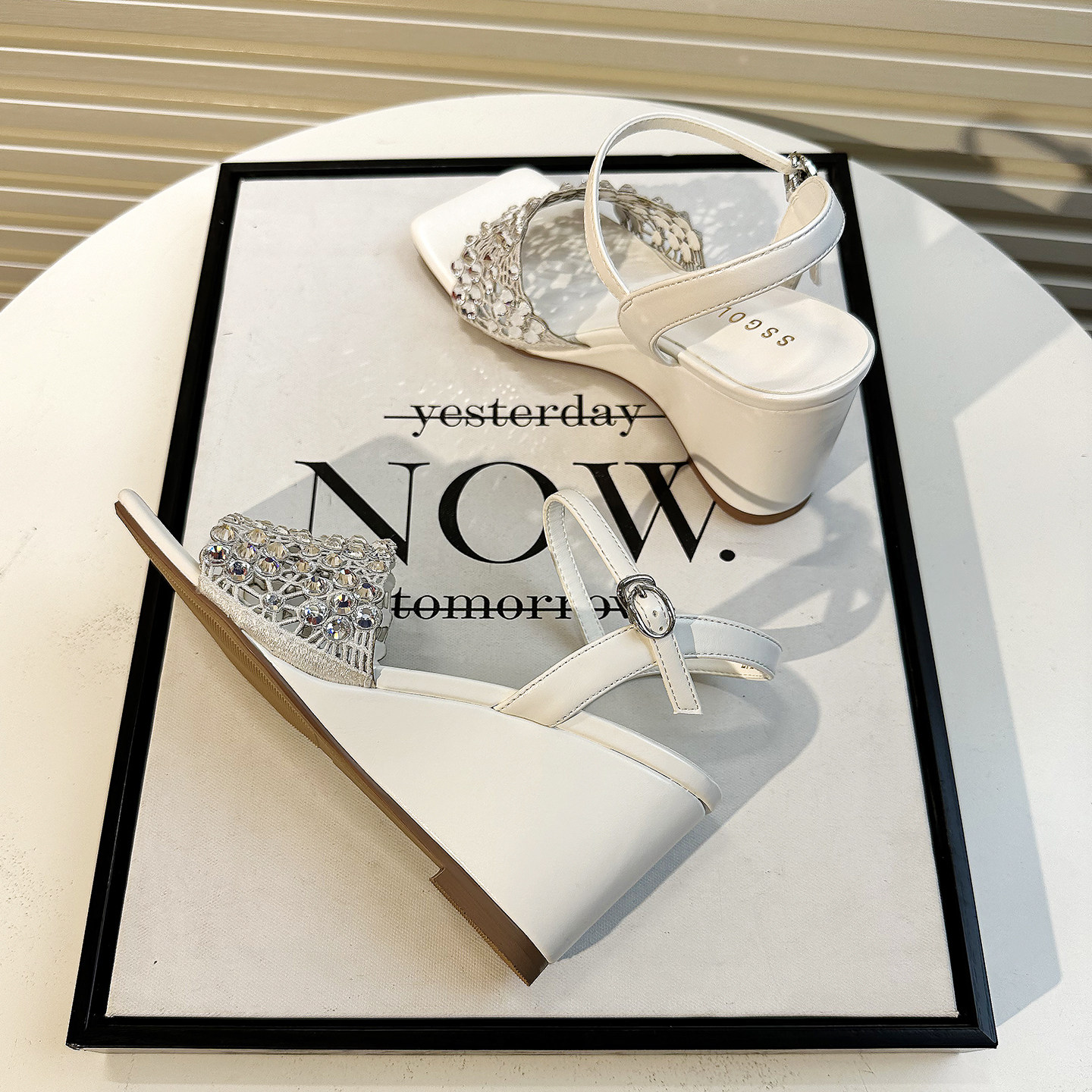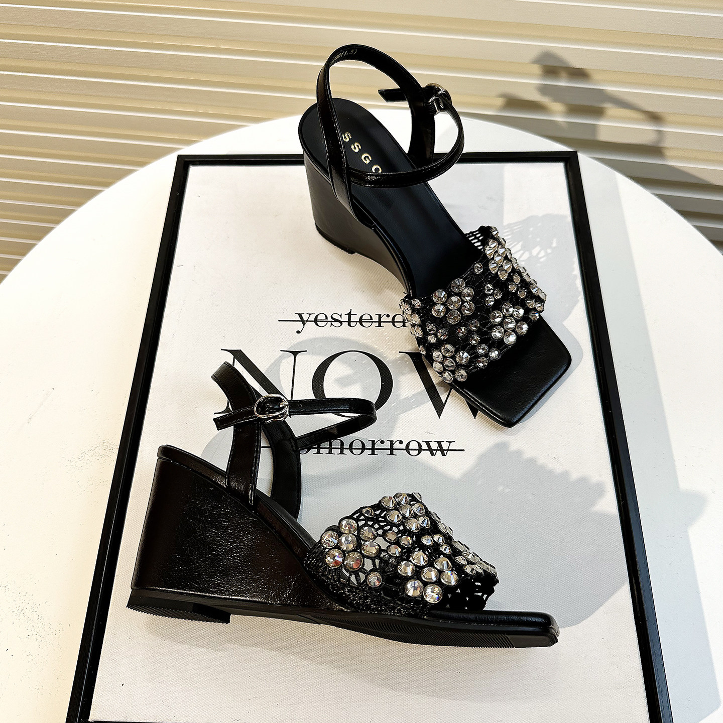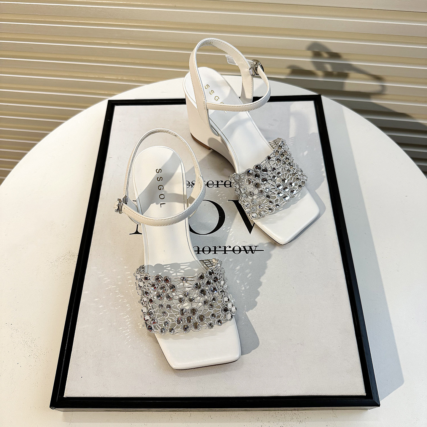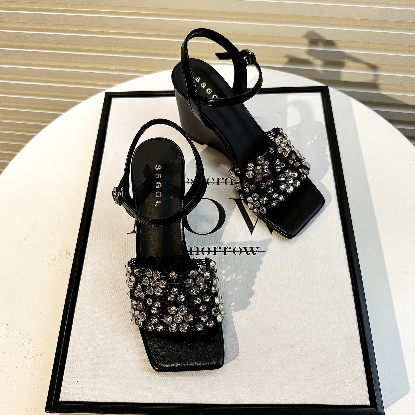 📚 高级感水钻镂空坡跟凉鞋女夏2026新款一字扣带方头露趾百搭高跟鞋
