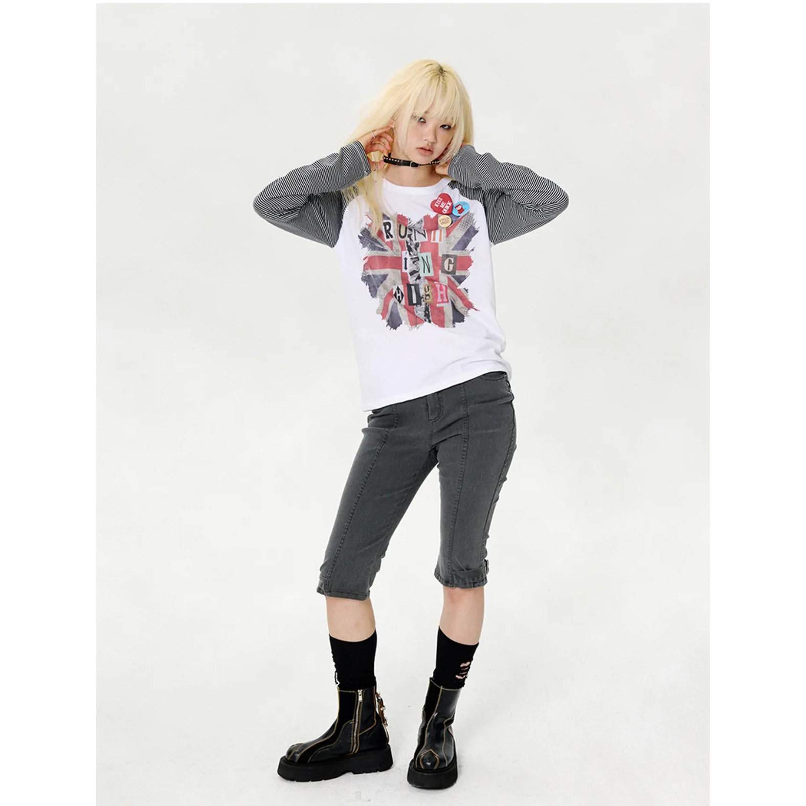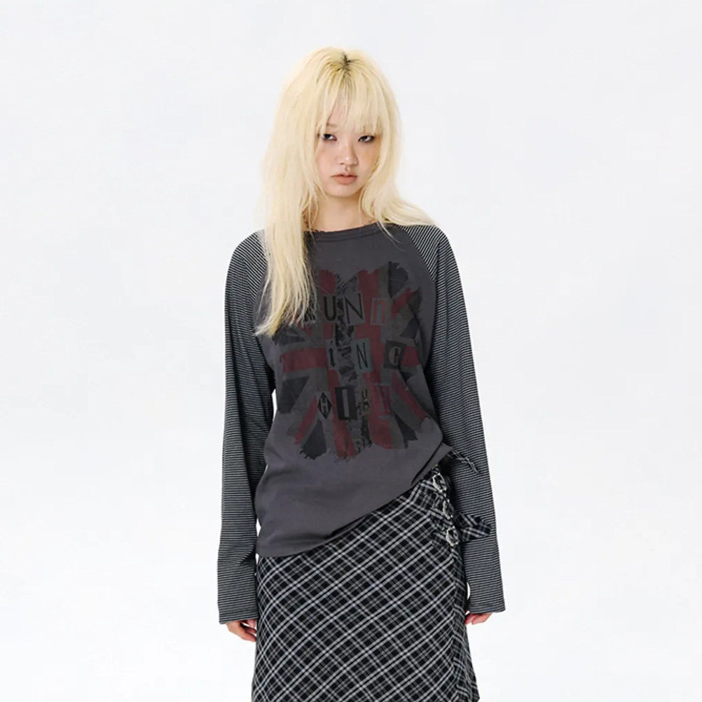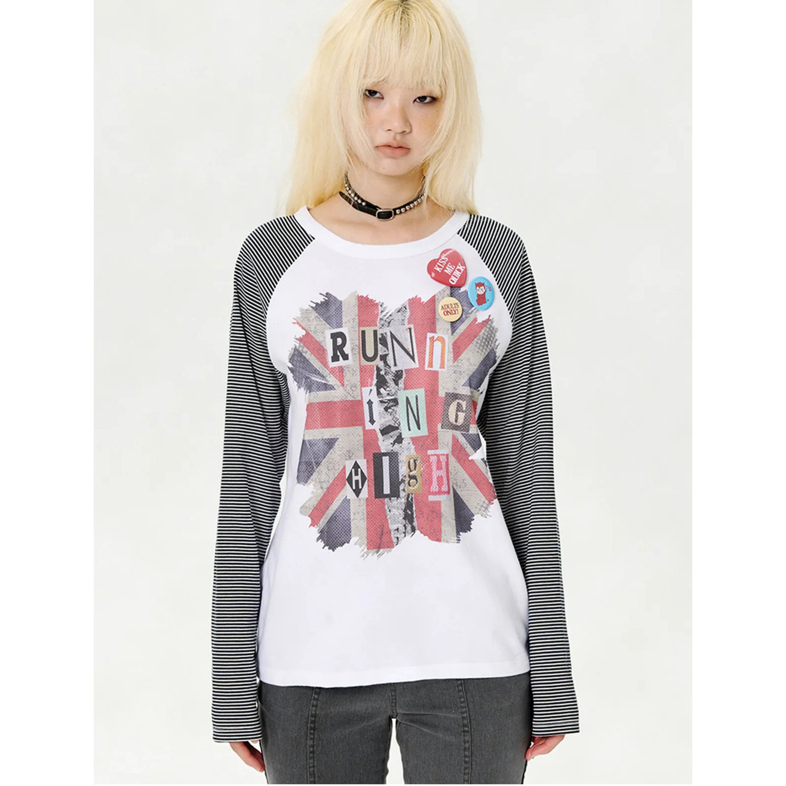 📚 runningHIGH 25秋新款条纹拼接米字旗印花长袖T恤韩国代购