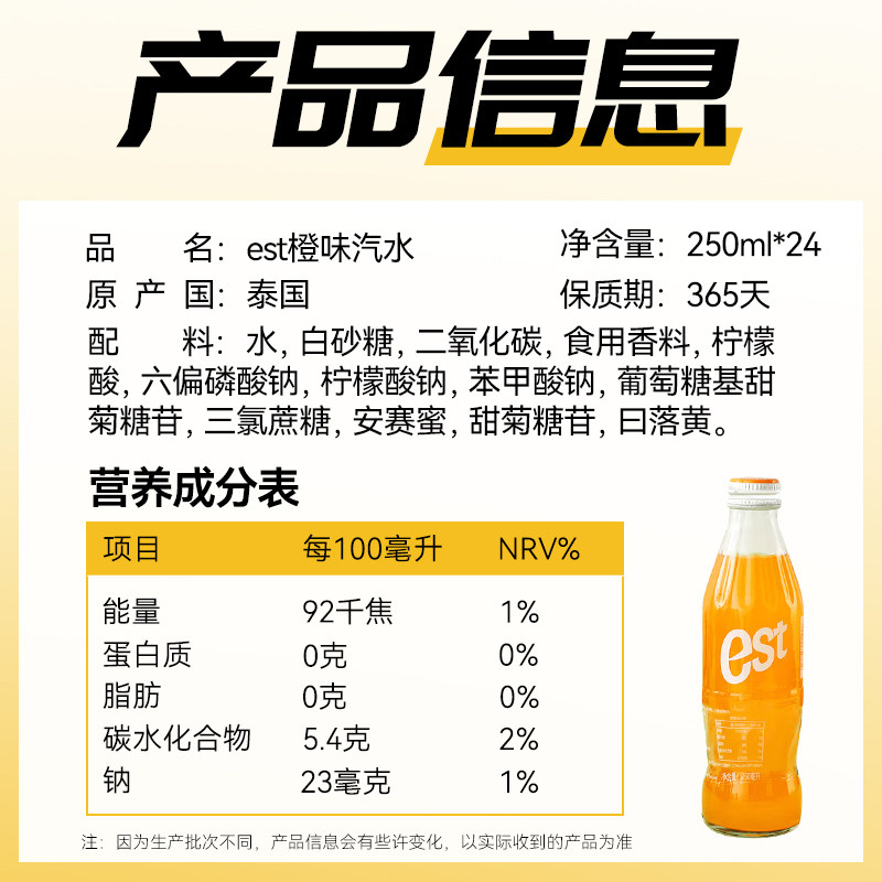📚 【包邮】泰国进口EST橙味汽水250ml*24瓶聚餐碳酸果味饮品玻璃瓶