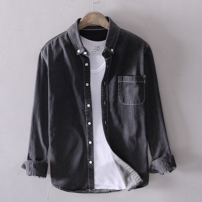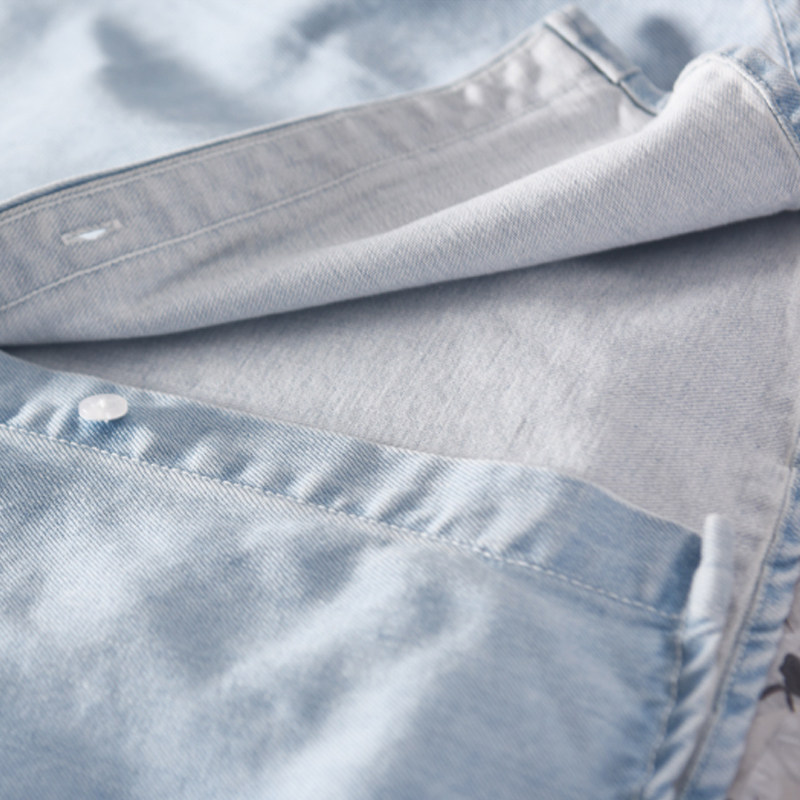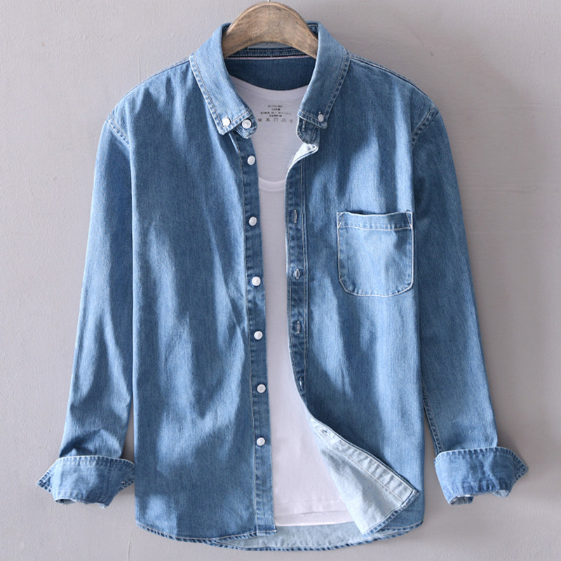 📚 浅色牛仔衬衫男长袖薄款夏季宽松纯棉水洗衬衣男士休闲上衣外套潮