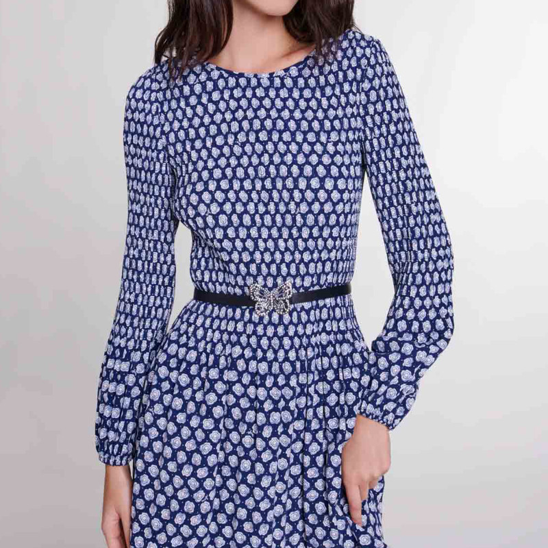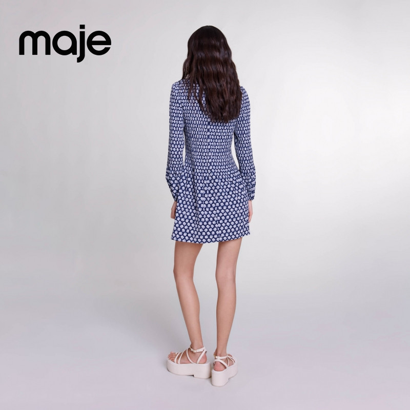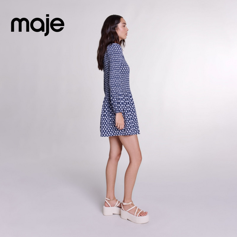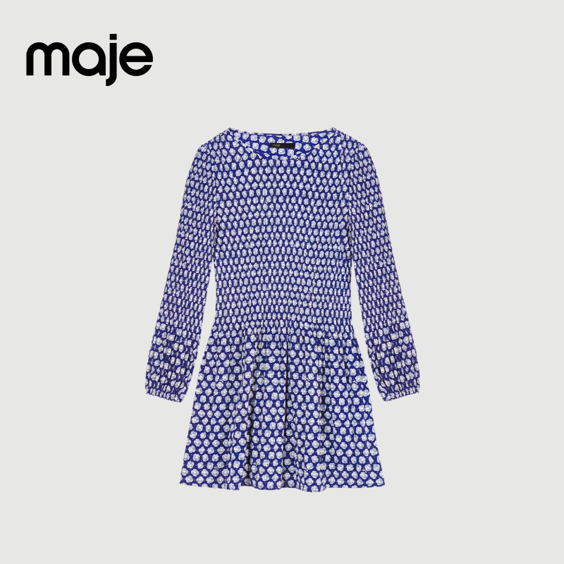 📚 Maje Outlets春夏女装法式浪漫蓝色印花圆领褶皱裙摆长袖连衣裙