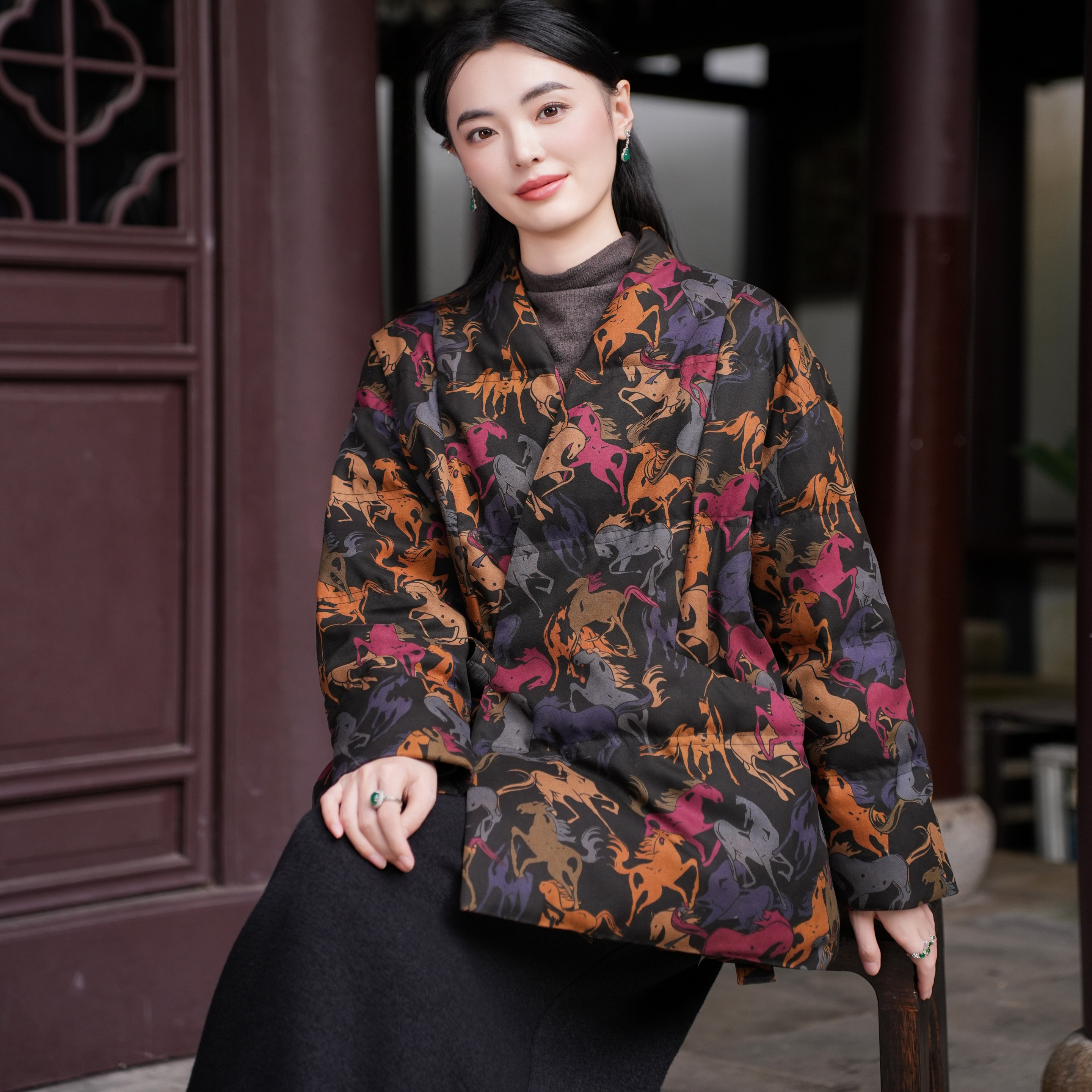 📚 【40MM香云纱 90白鹅绒】觅萝香 绢纺提花老料 V领系带长袖羽绒服