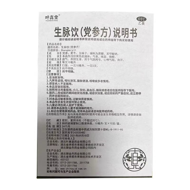 📚 叶真堂 生脉饮(党参方) 10ml*10支/盒 心悸气短 益气养阴生津