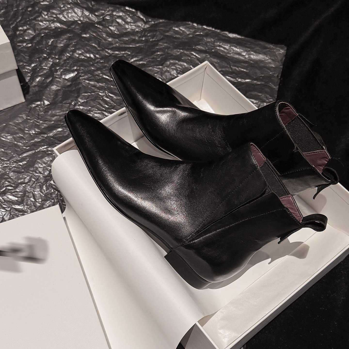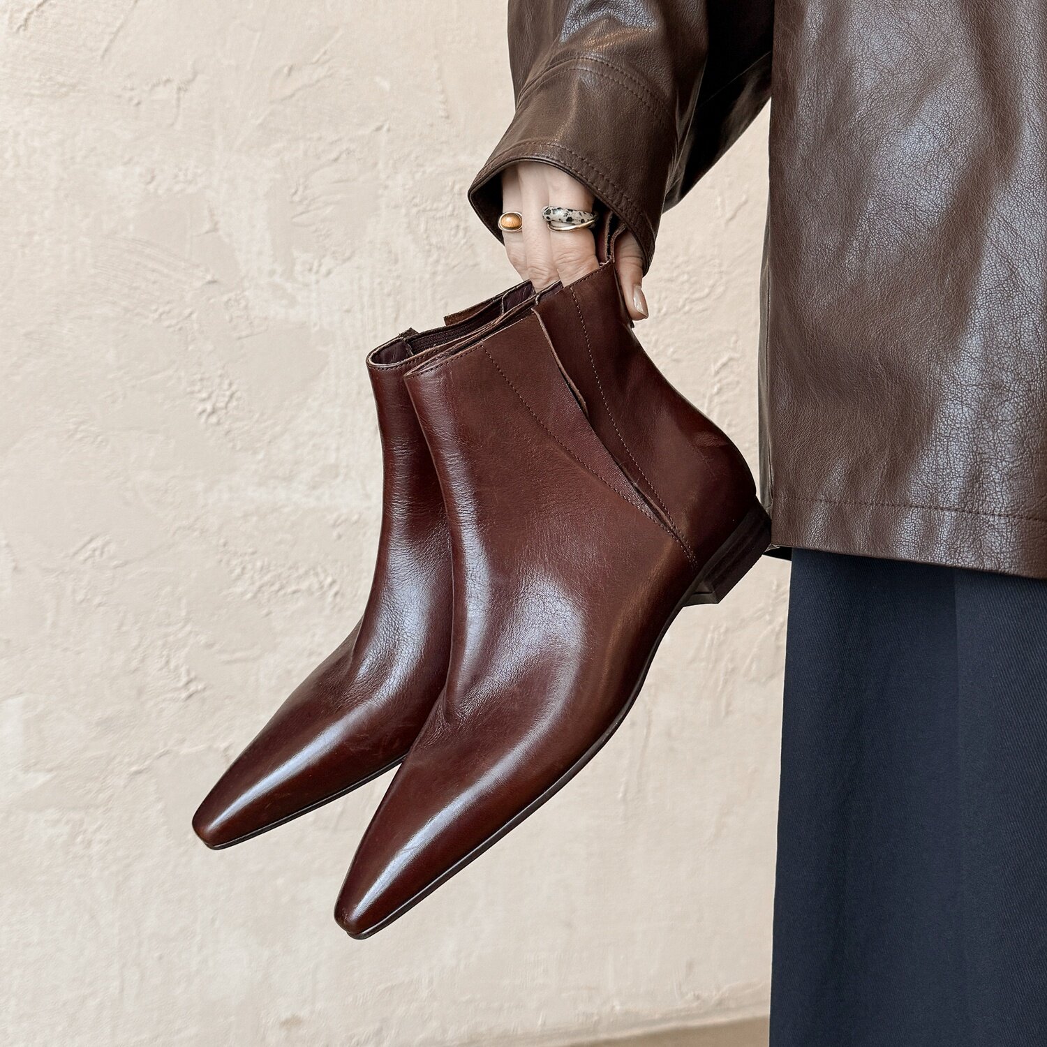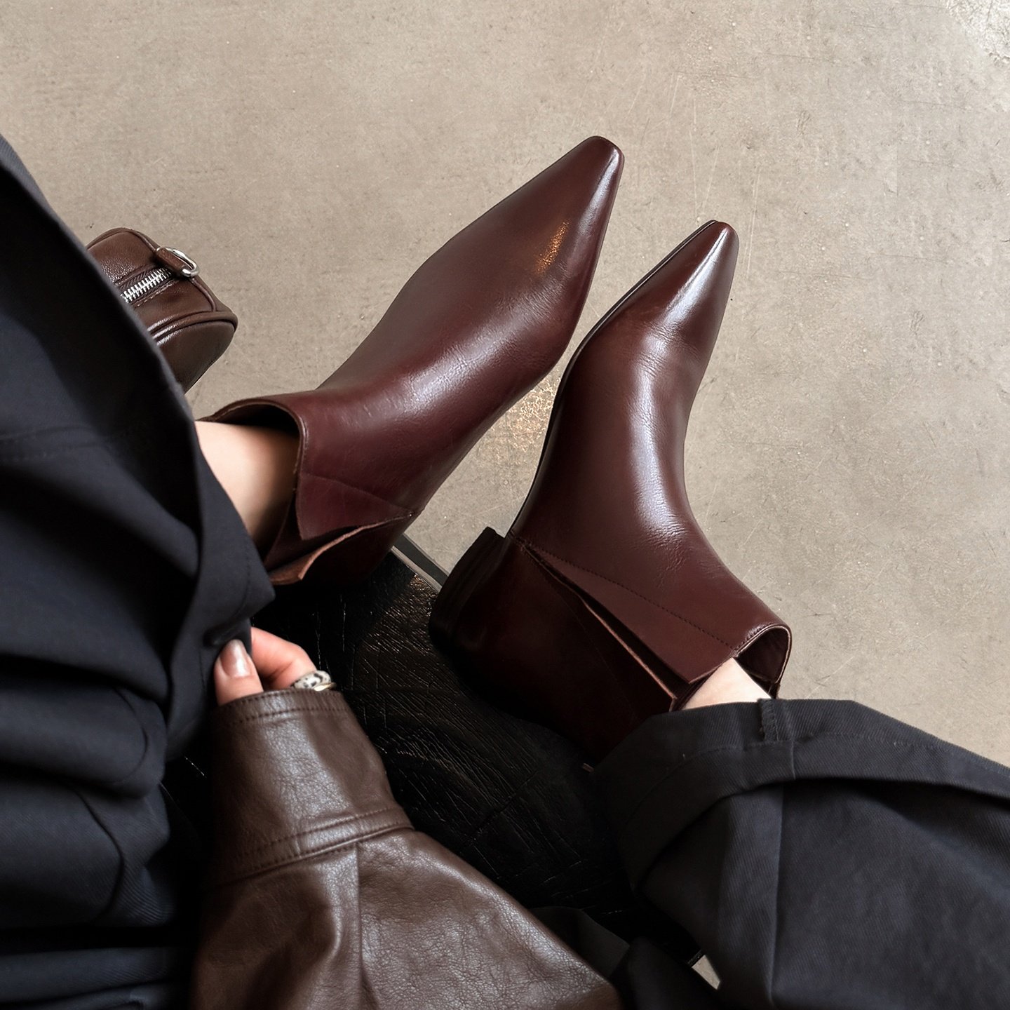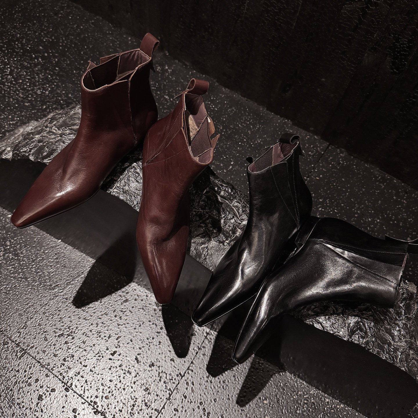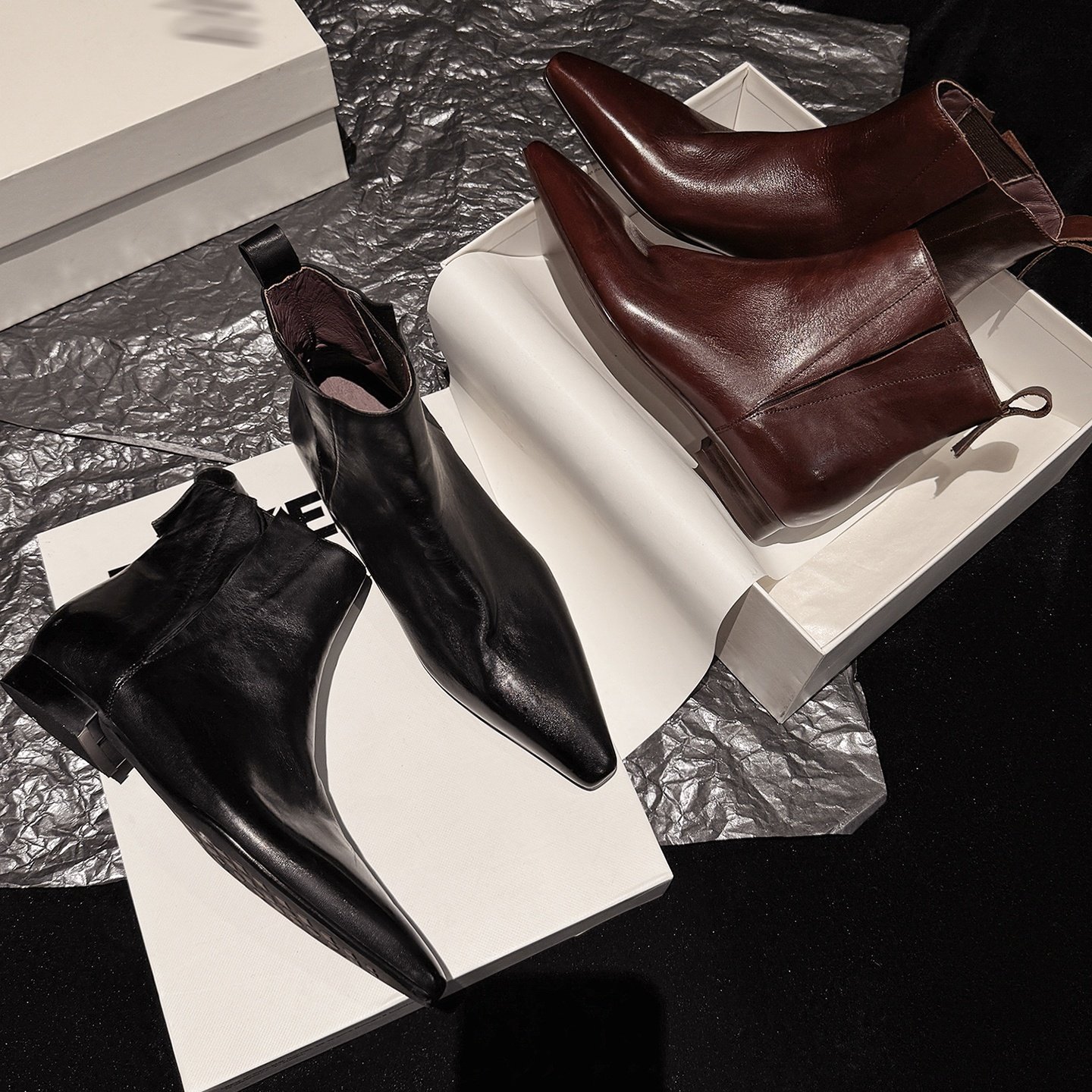 📚 店主自留 Elegan真皮牛皮短靴子短靴女靴子尖头平底切尔西靴中跟