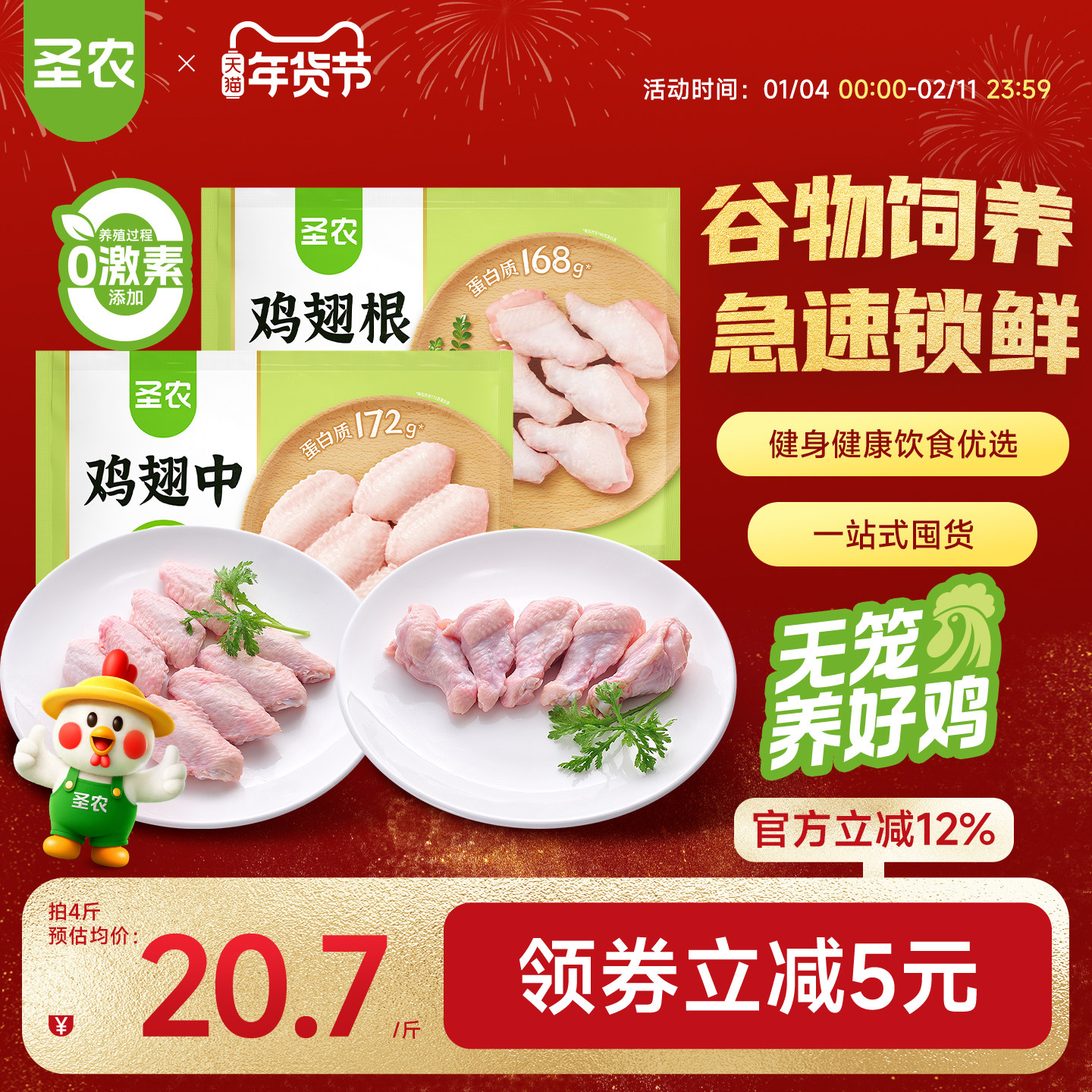📚 圣农养殖0激素新鲜冷冻鸡翅中翅2斤+翅根2斤生鲜冷冻食材家庭装