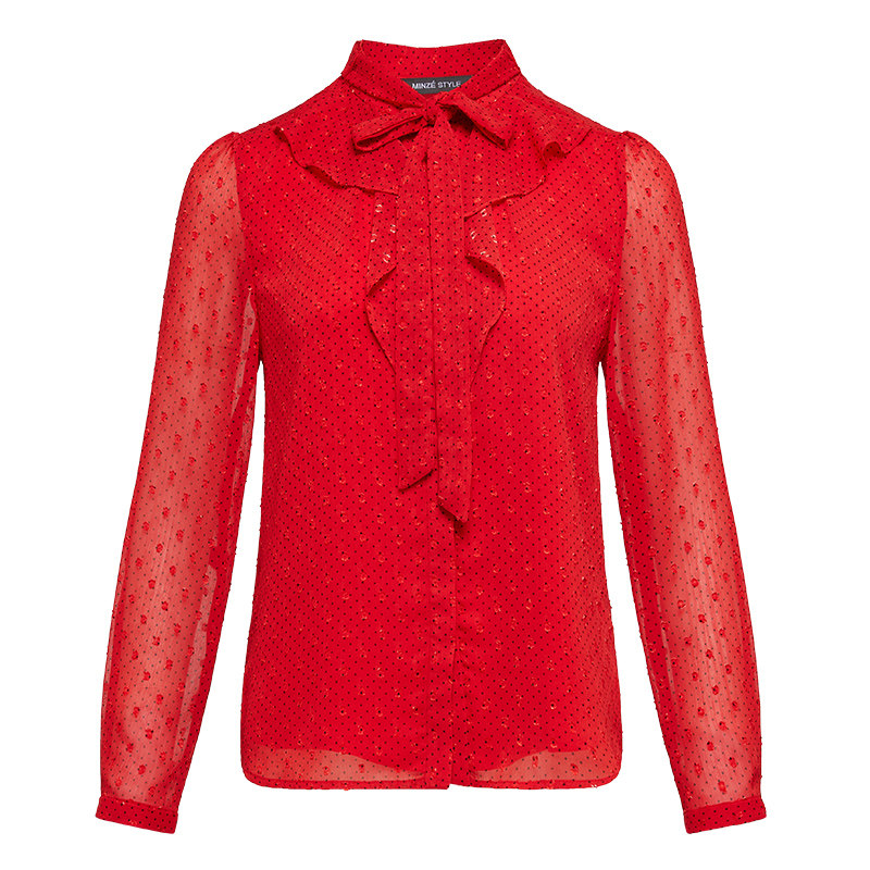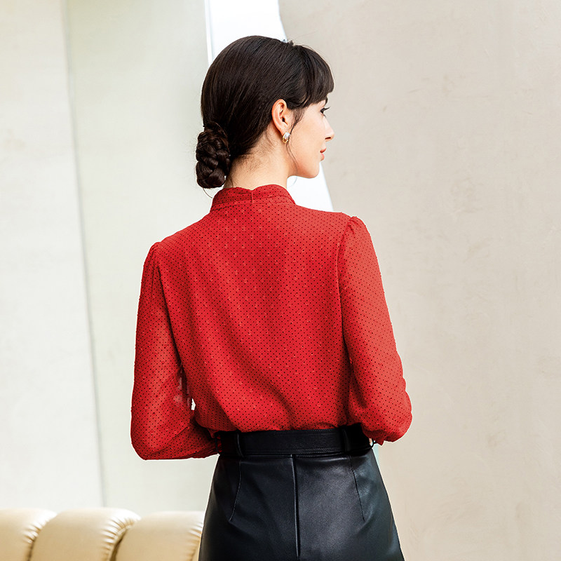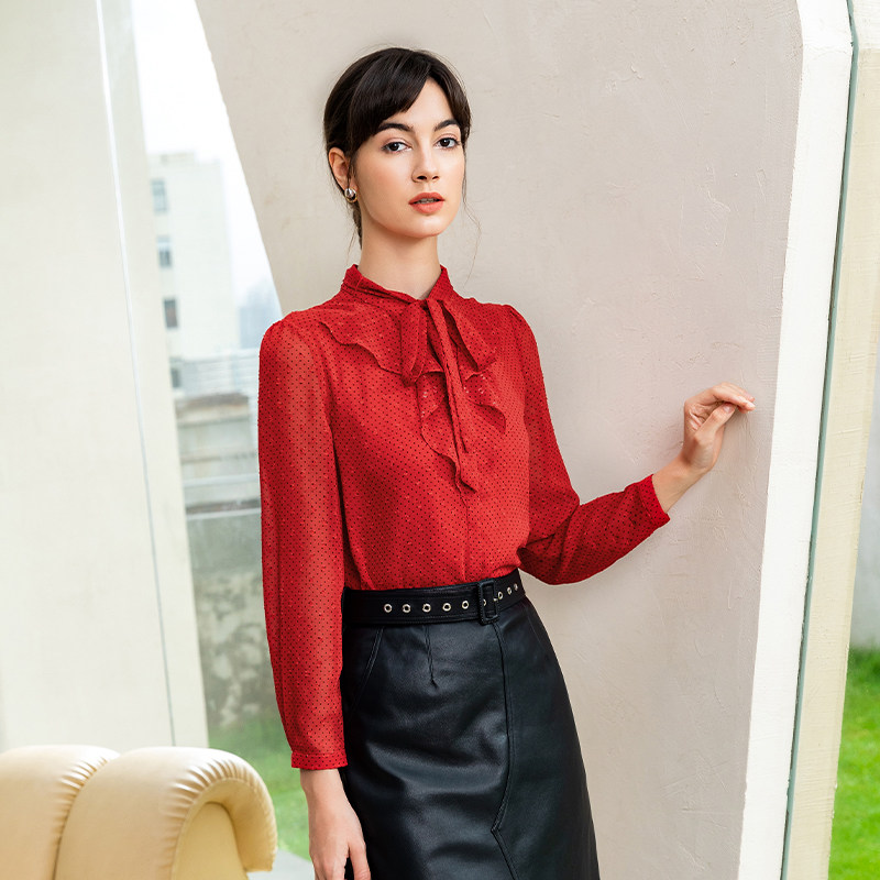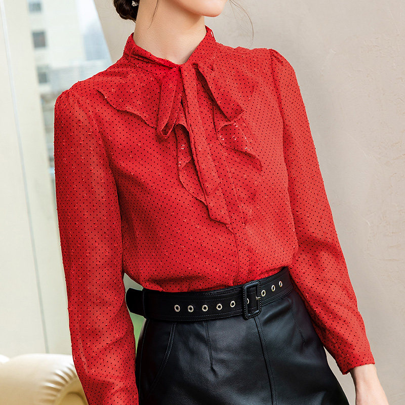📚 名师路红色衬衫女上衣秋新款荷叶边长袖薄款波点绑带直筒
