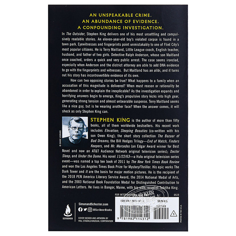 38¥ MF278 RGHsUOntOhf¥ https://m.tb.cn/h.7Elp6TE 预售 【中商原版】斯蒂芬·金:局外人 英文原版 The Outsider Stephen King Simon & Schuster 惊悚推理小说 --------------------- 【原售价】68元 【现售价】68元。