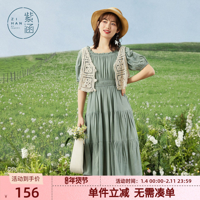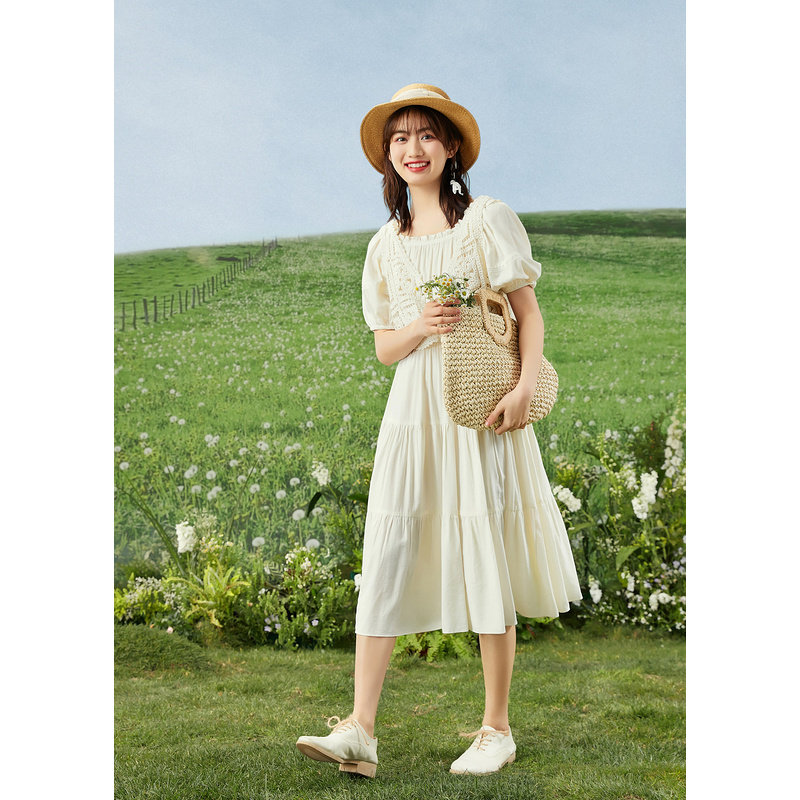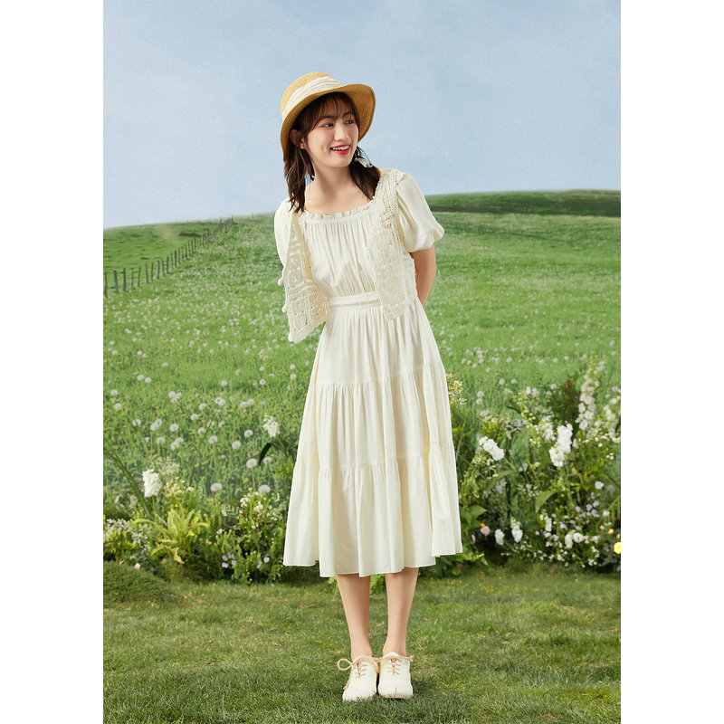 📚 紫涵森系连衣裙套装夏季新款时尚拼接花边裙子勾花马甲两件套散摆