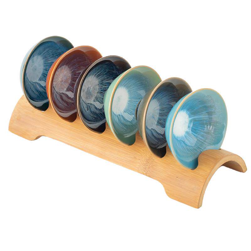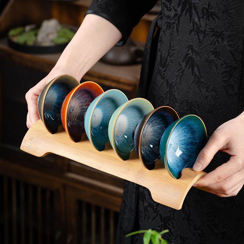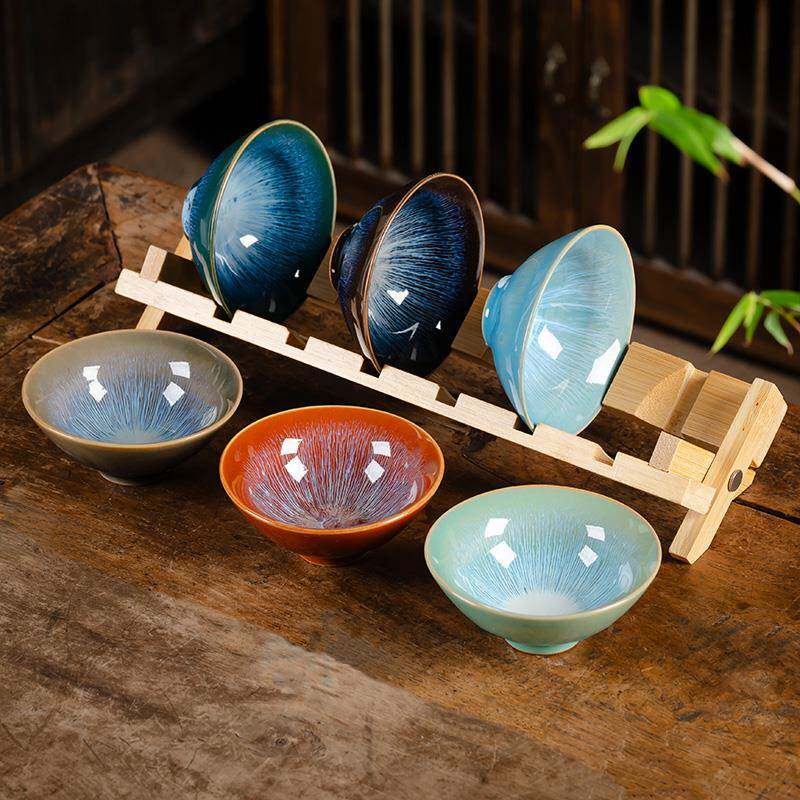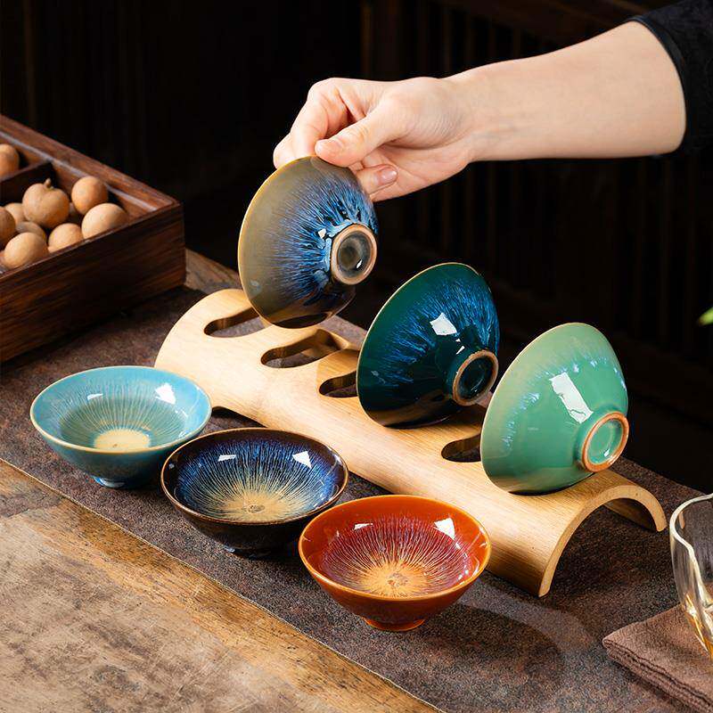 📚 窑变建盏茶盏陶瓷茶杯 6个不同颜色斗笠杯茶碗品茗杯套装竹茶杯架