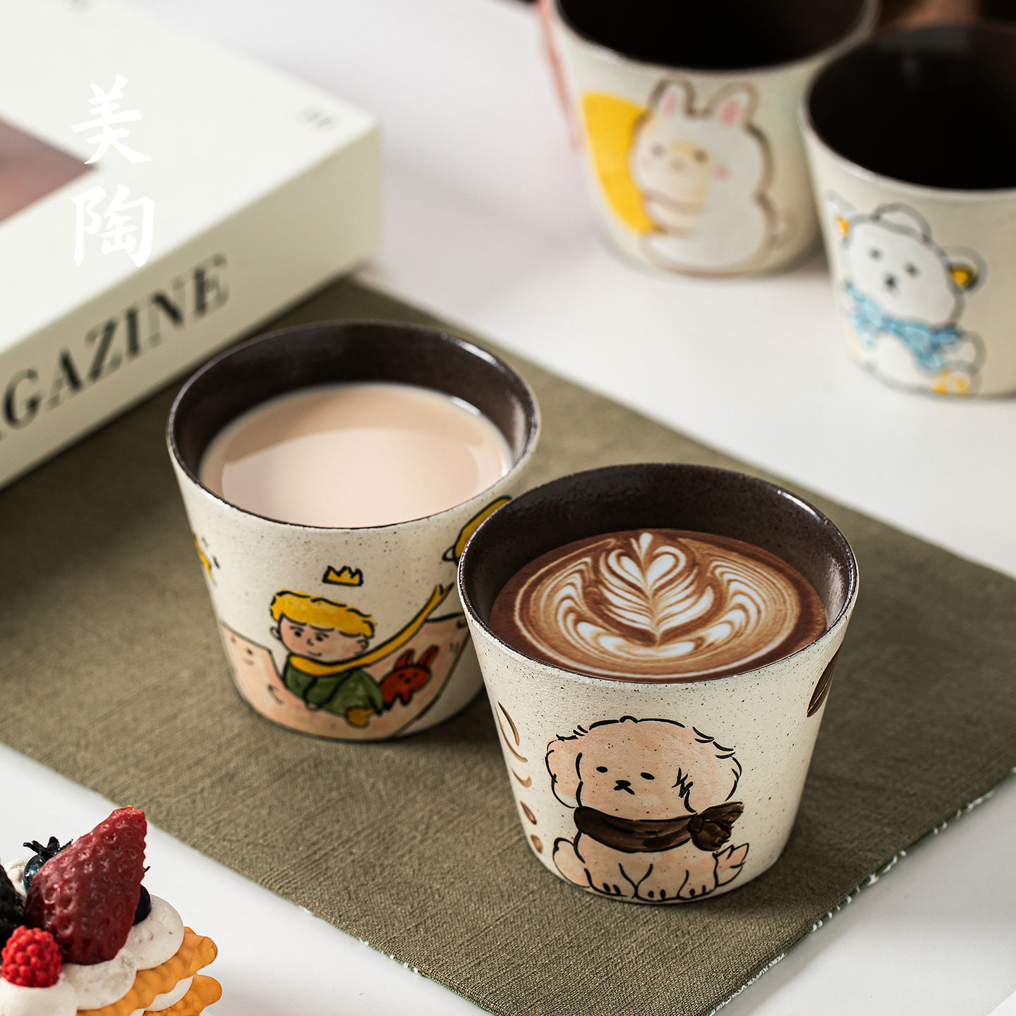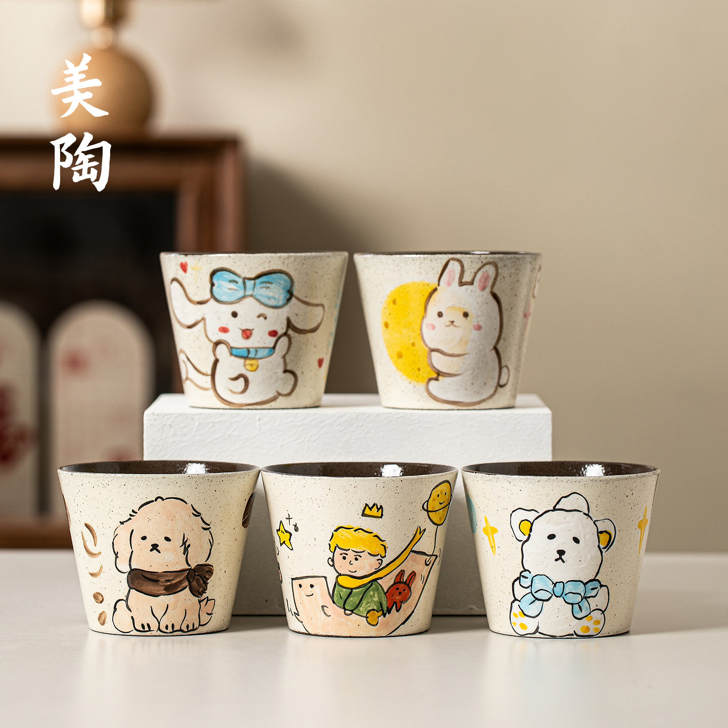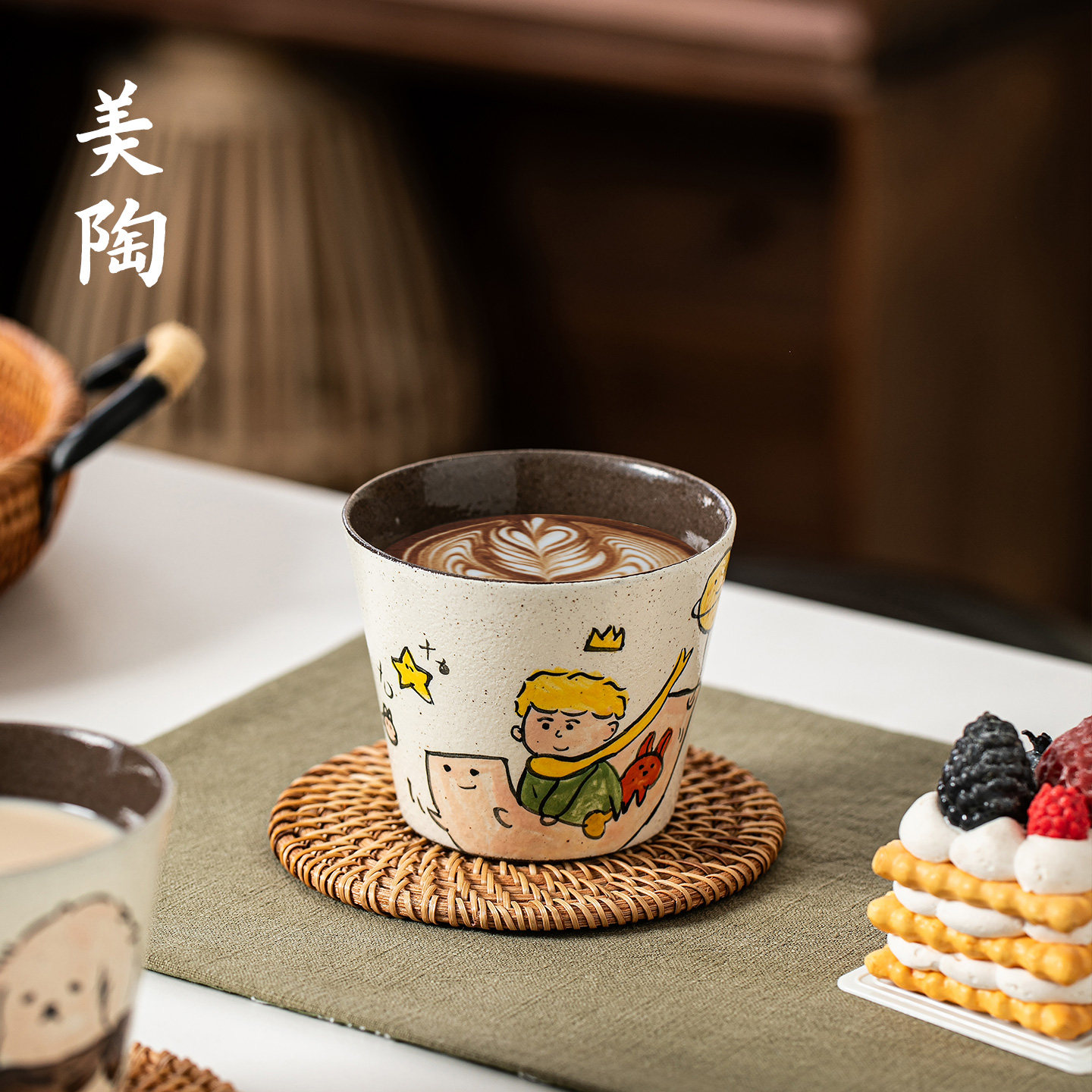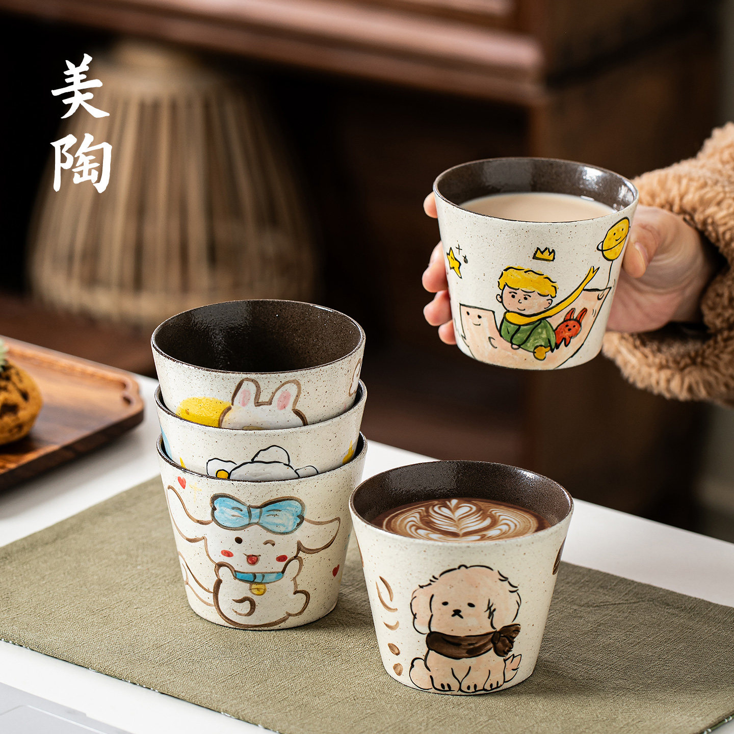 📚 景德镇手作粗陶猪口杯手绘釉下彩咖啡杯复古紫黑陶泥拉花杯茶水杯