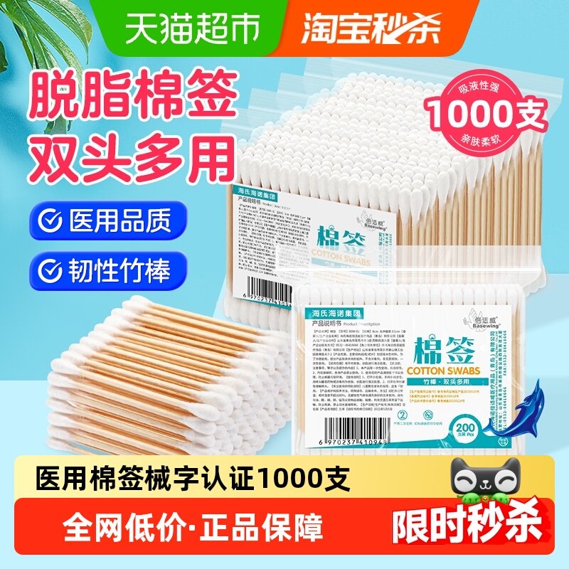 📚 海氏海诺双头棉签便携装棉棒化妆掏耳朵棉花棒竹棒1000支