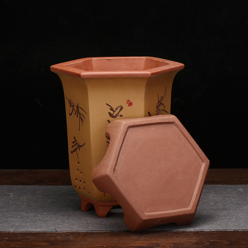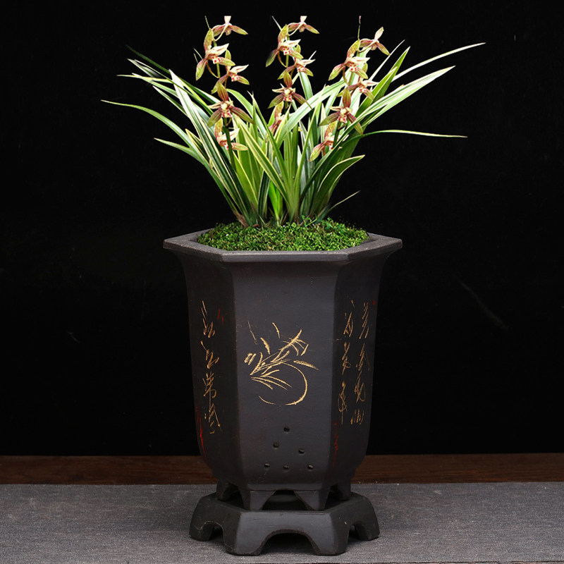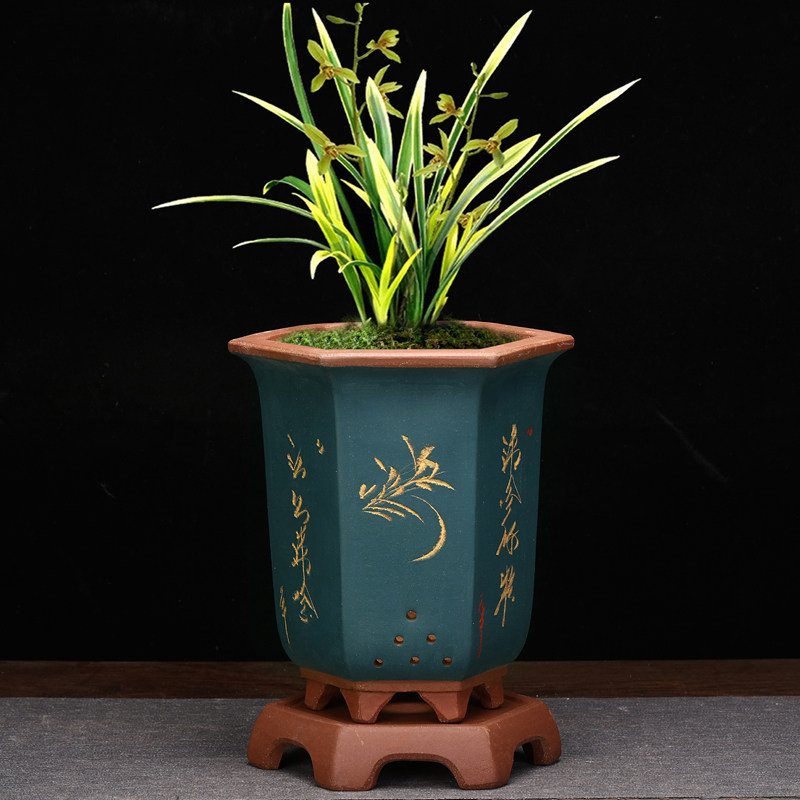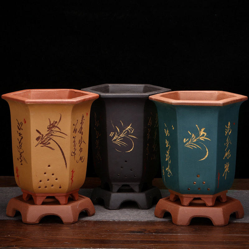 📚 宜兴紫砂花盆六方带底座兰花专用盆刻绘君子兰春兰蕙建兰桌面包邮