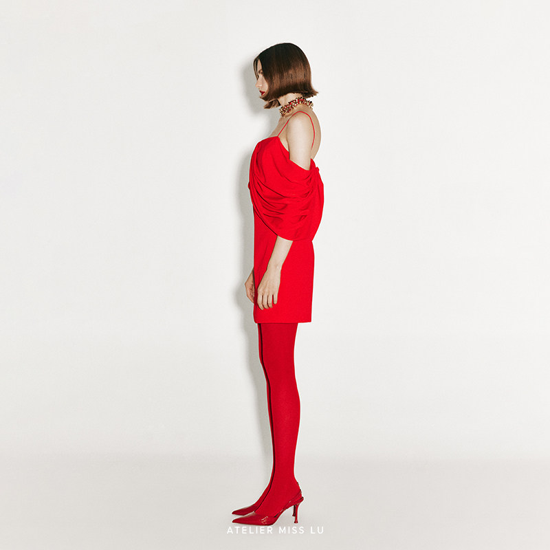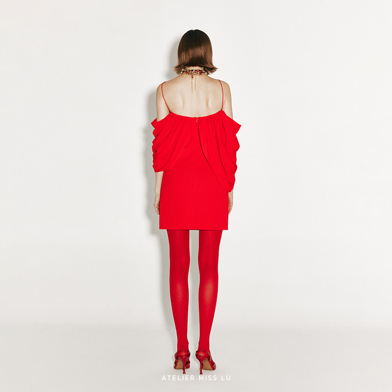 📚 AtelierMissLu【弗拉明戈】2024秋冬不规则垂褶露肩吊带连衣裙