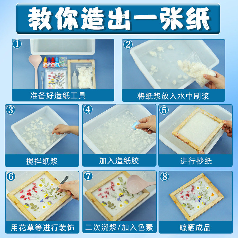 📚 古法造纸术材料包套装儿童手工diy制作再生花草纸浆木框纱网工具