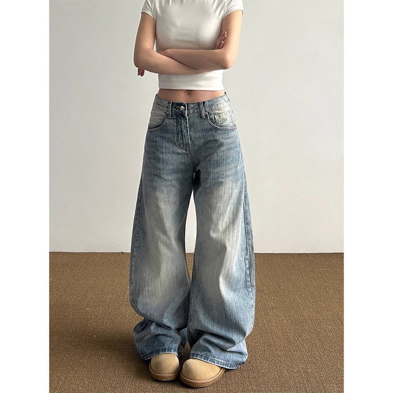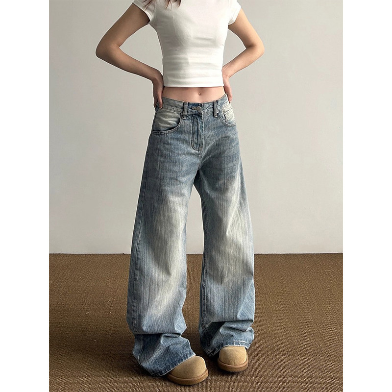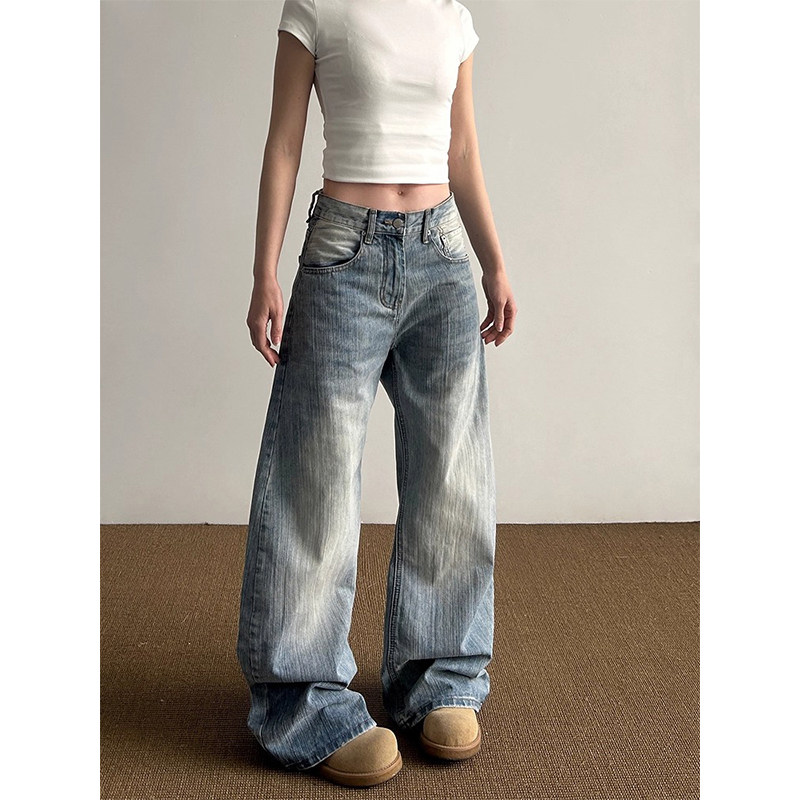📚 美式复古水洗竹节纹弯刀牛仔裤女2026春季新款宽松直筒阔腿长裤子