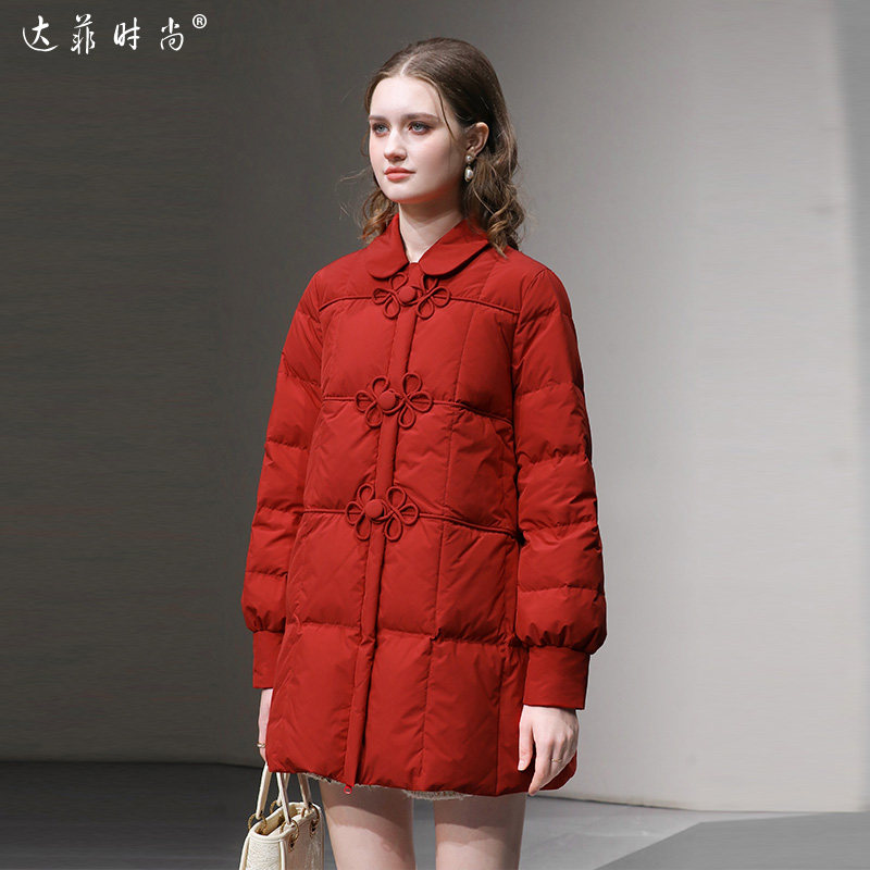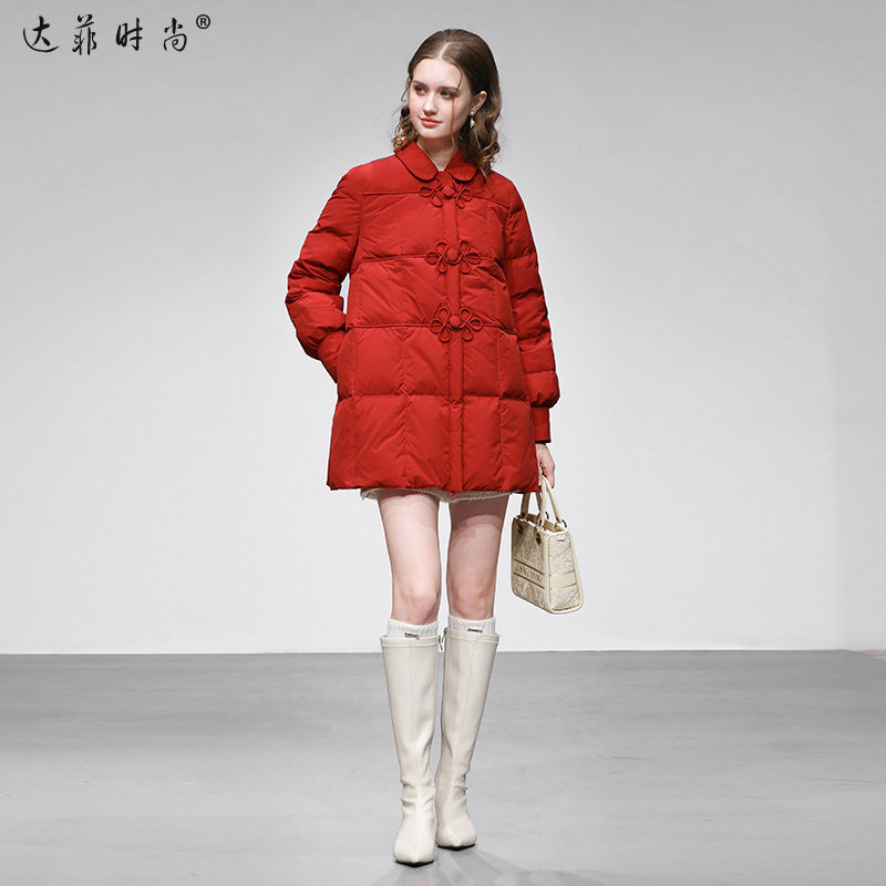 📚 2025冬季新款时尚千金风娃娃领国风盘扣A字红色年衣加厚羽绒服女