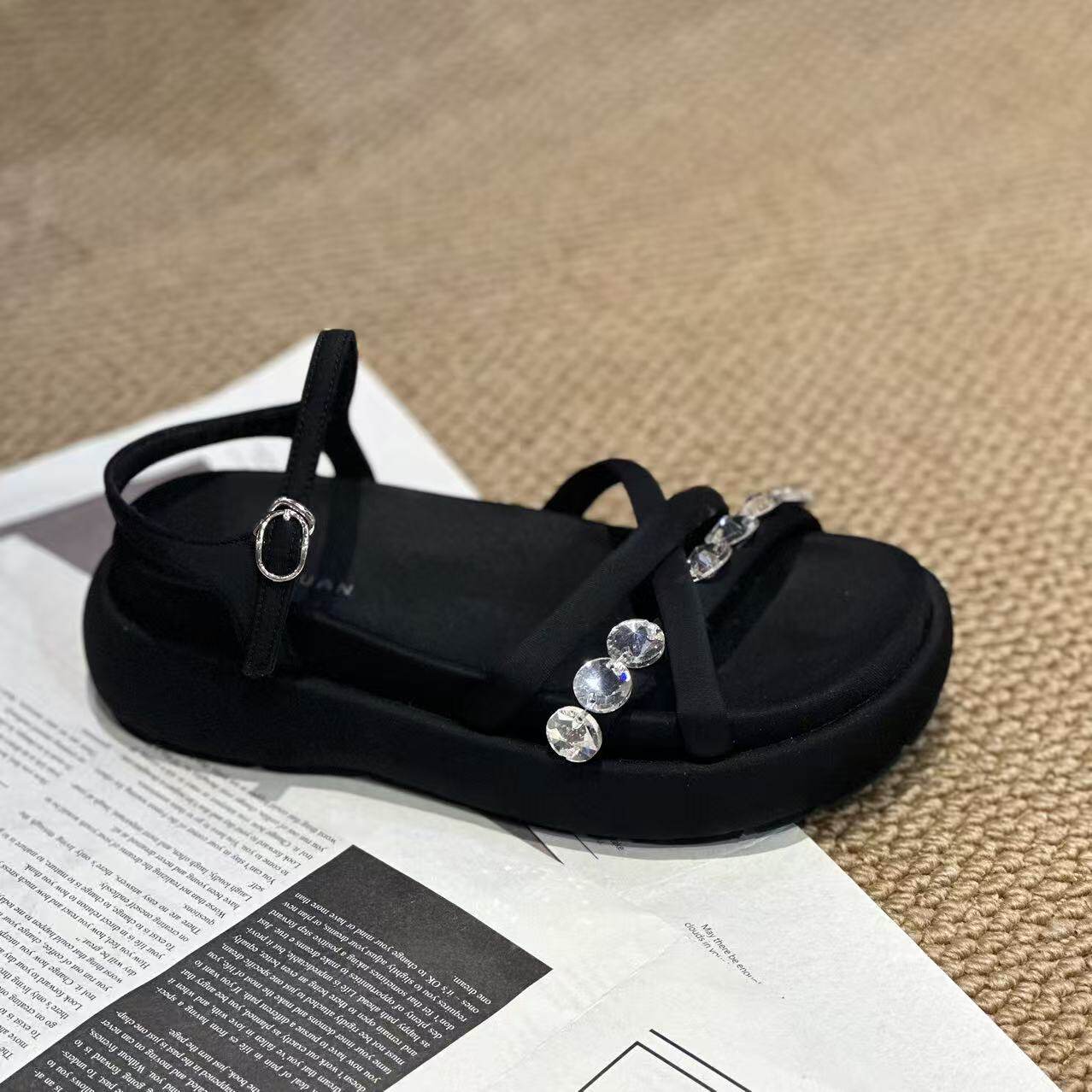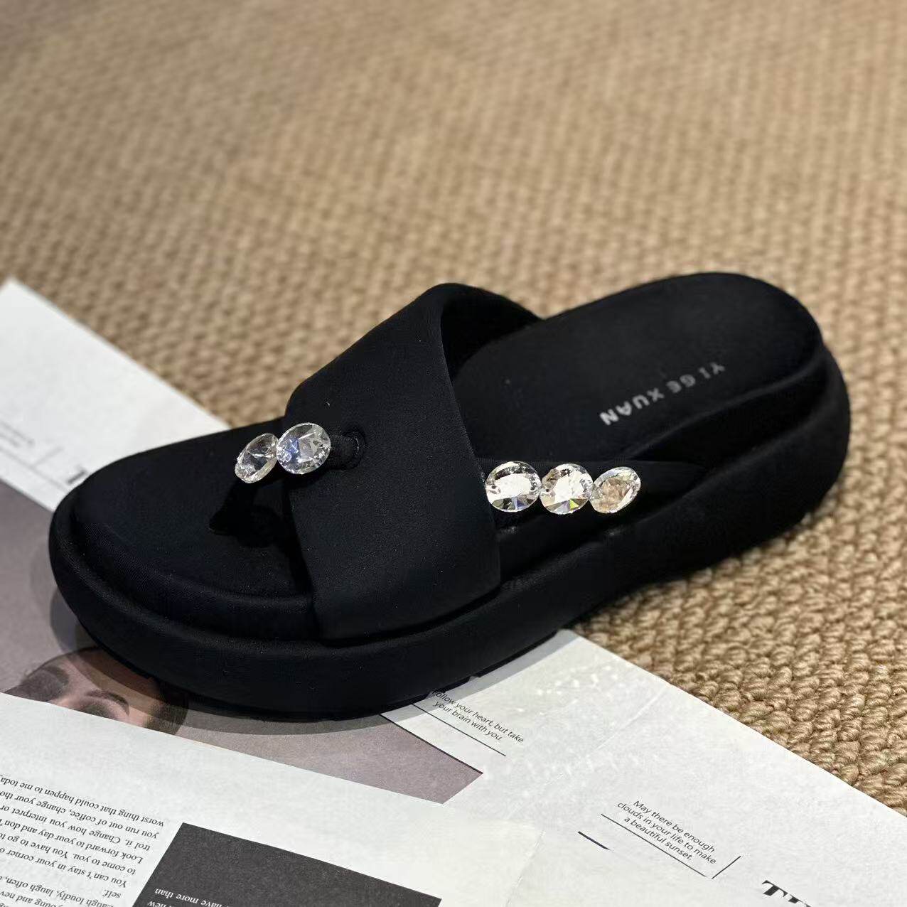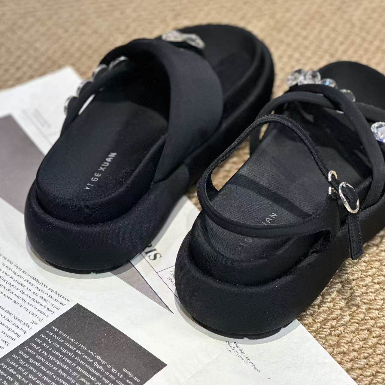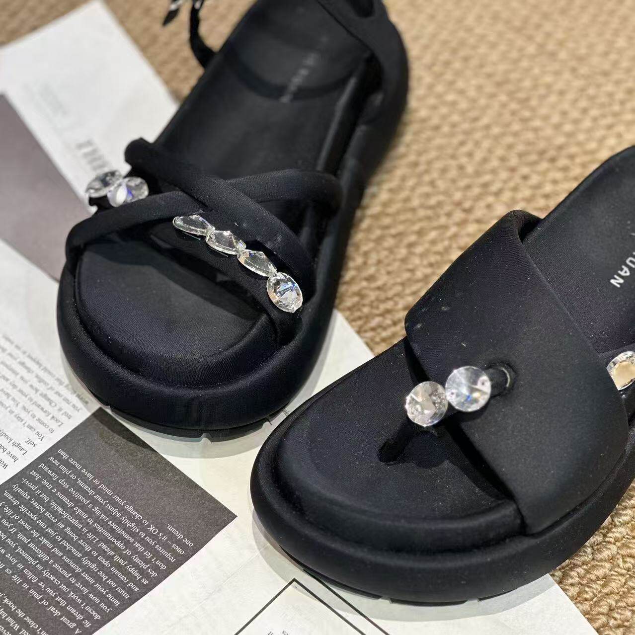 📚 【手工高奢女鞋】不算重 新款厚底水钻百搭真丝布拖鞋/凉鞋