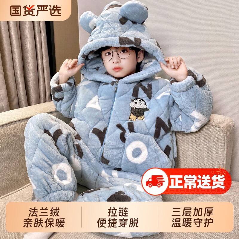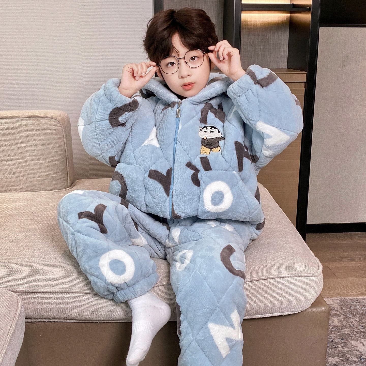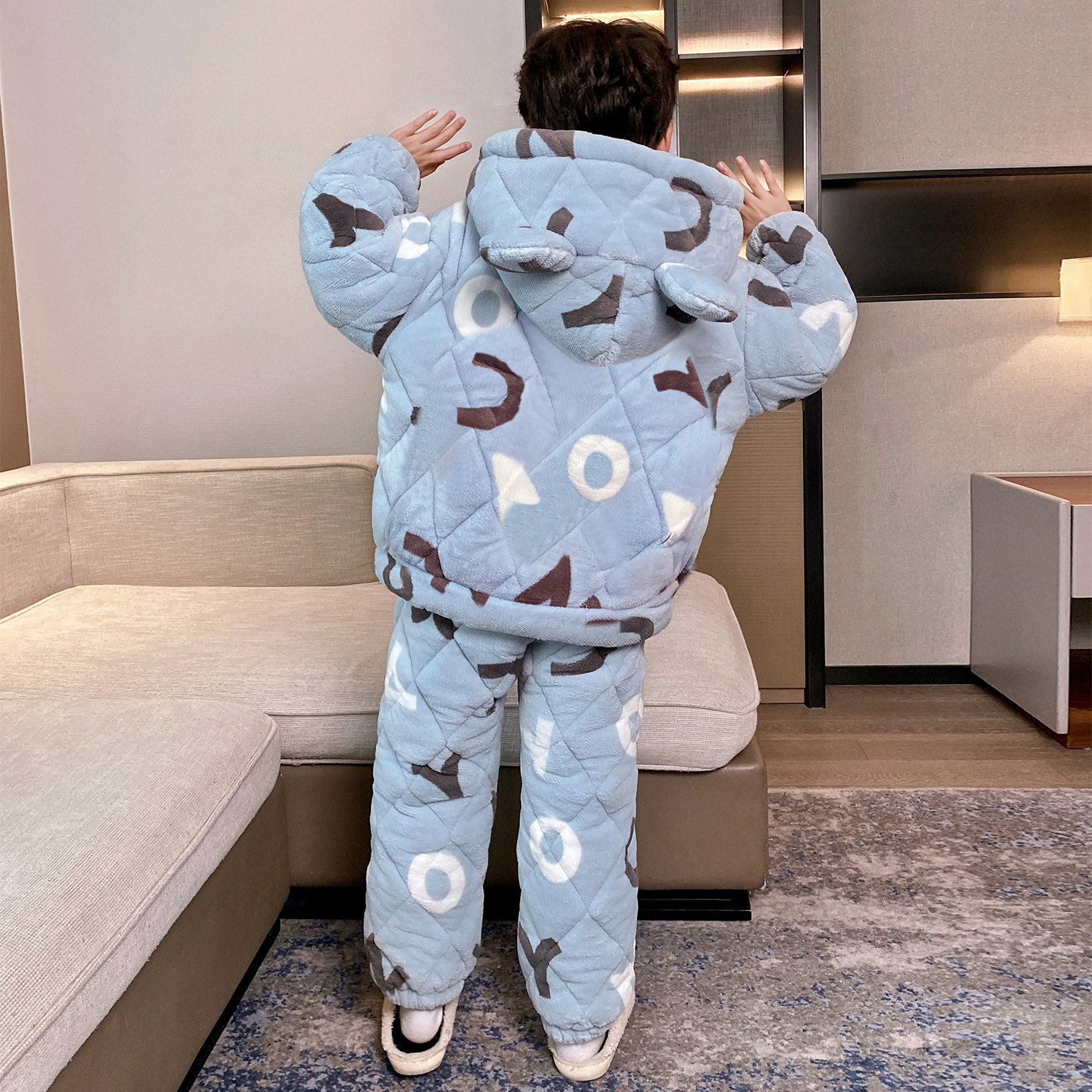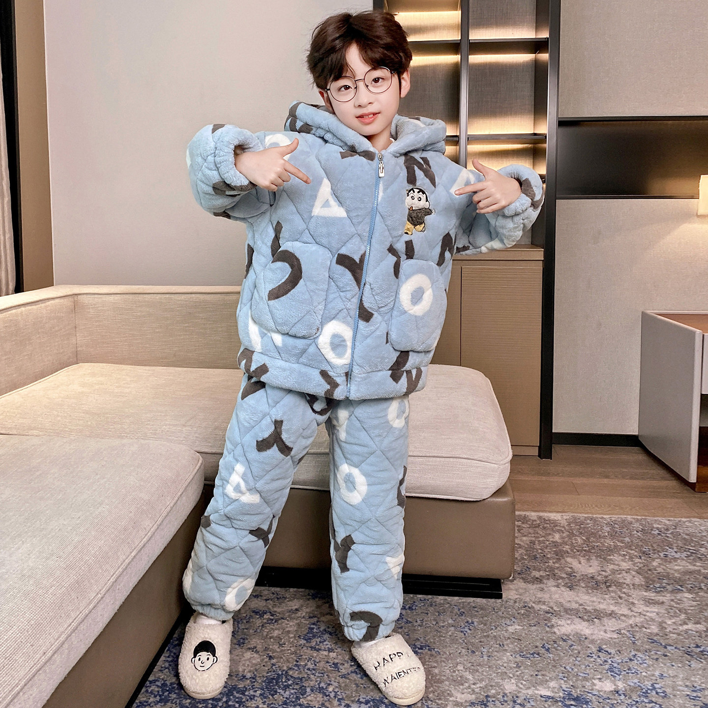 📚 男童睡衣冬季三层夹棉加厚珊瑚绒儿童青少年中大童冬款男孩家居服